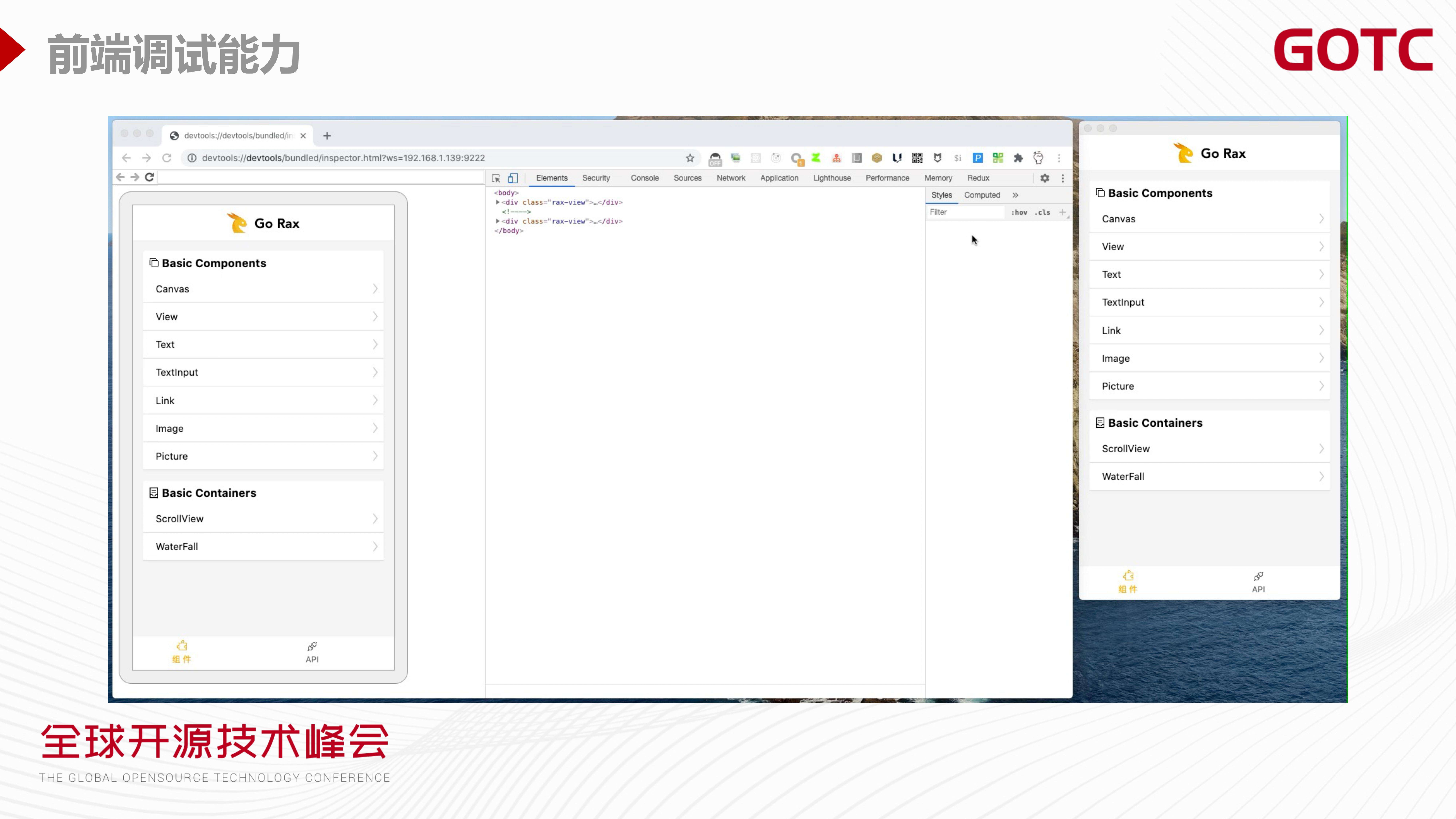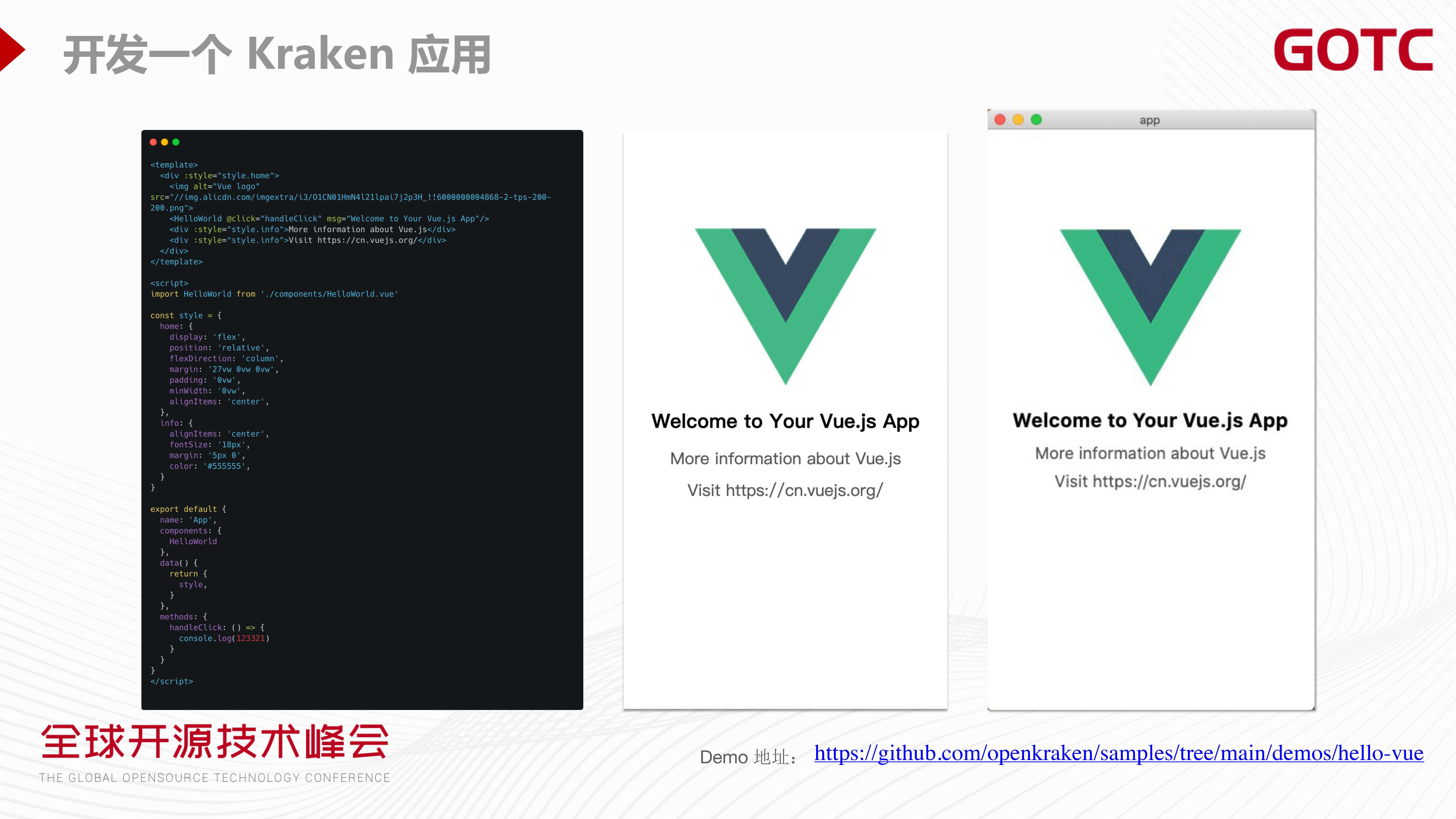 可以看到的是,最左边是 Vue 的相关代码,右边分别是该应用在 Chrome(左)上跑的结果以及在 Kraken(右)上跑的结果,大家可以看到结果是完全一致的。