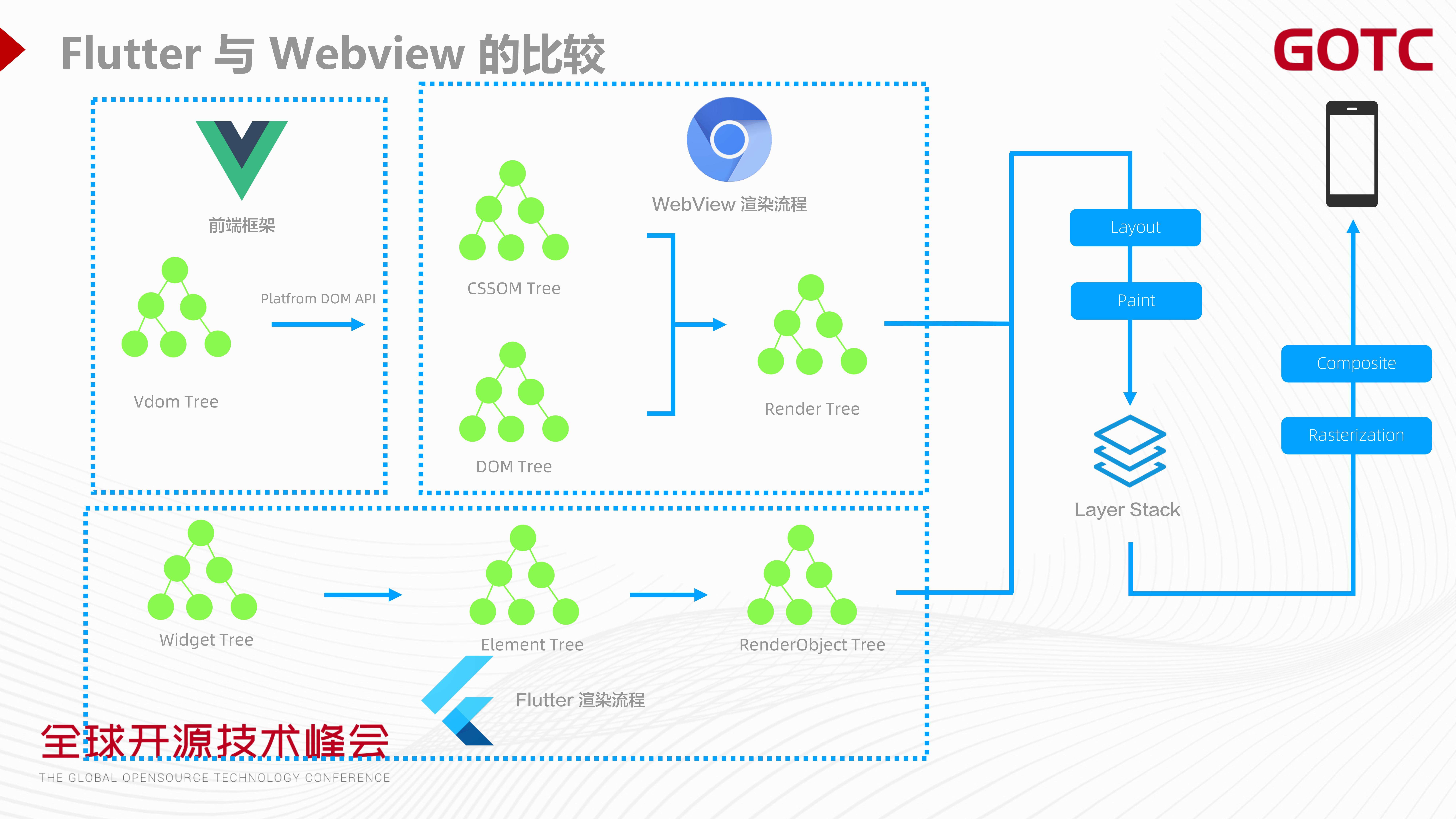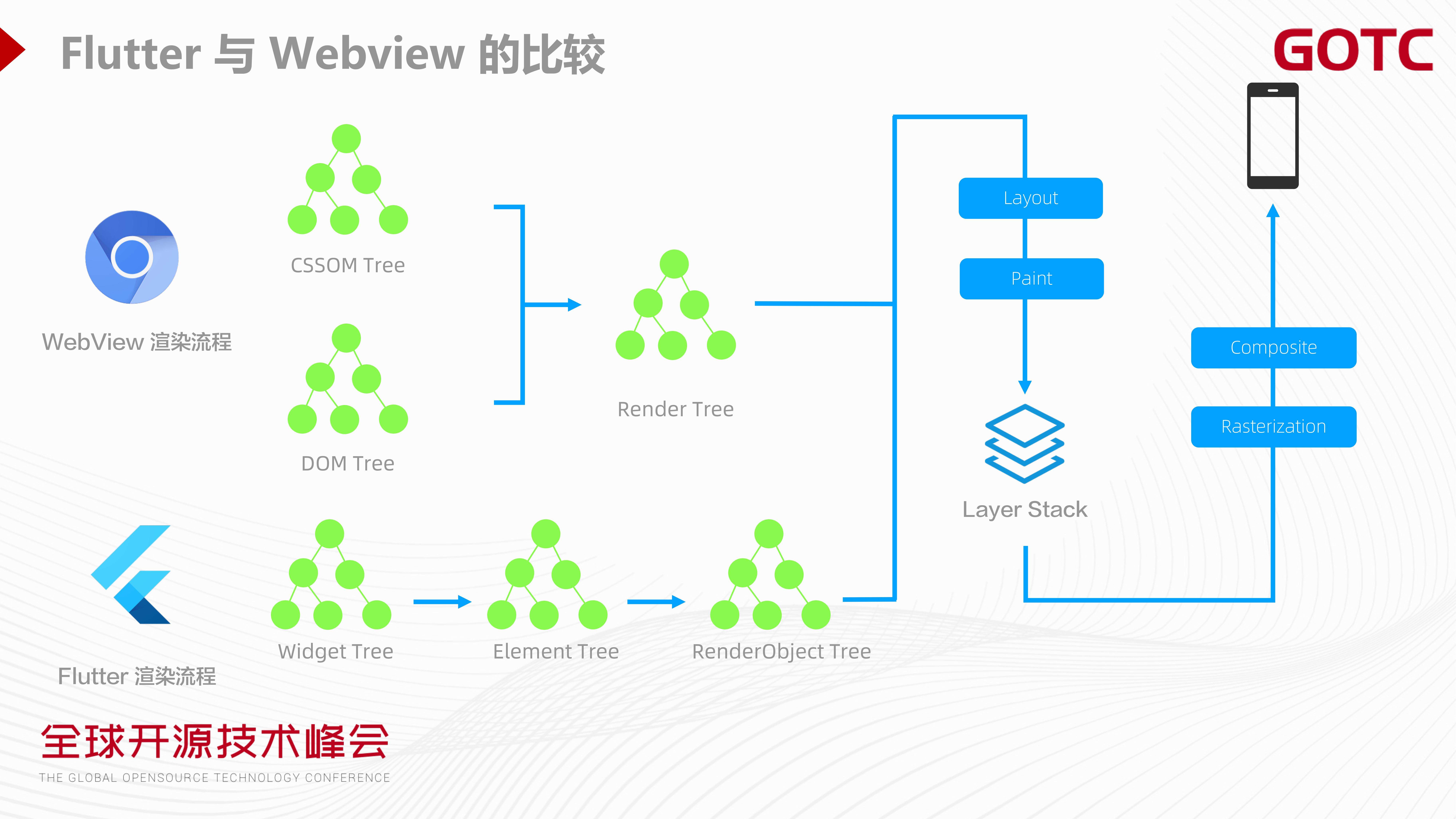 再看 Flutter 这边,Flutter 经典的三棵树——Widget Tree、Element Tree 以及 RenderObject Tree。Widget Tree 对应到前端类似于前端框架这层,而 Element 与 DOM Tree,RenderObject Tree 与 Render Tree 分别对应,最终也会通过 Layout 以及 Paint 一系列计算生成 Layer,然后通过合成以及光栅化渲染到屏幕上。