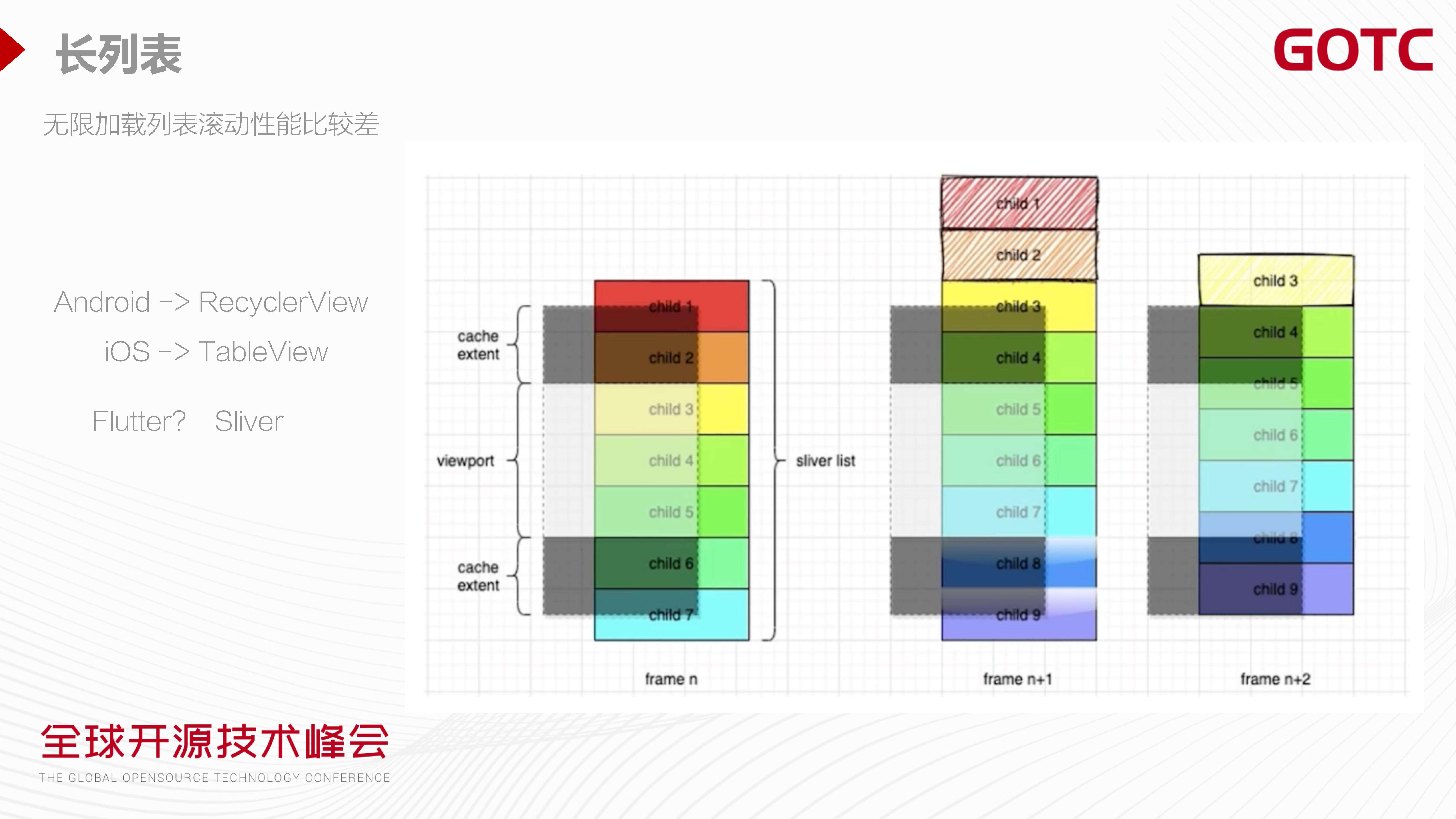 在 Android 跟 iOS 上也分别有 RecyclerView 以及 TableView 来解决该问题,他们的原理分别是在可视区域 viewport 外定义一块缓冲区域,当节点超过该区域时进行动态释放,进入该区域时动态创建,以及通过一系列节点进行属性替换的方式来保证节点数不爆炸。Flutter 中也提供了类似实现 Sliver,那么我们能否用 Sliver 赋能前端解决该问题呢?