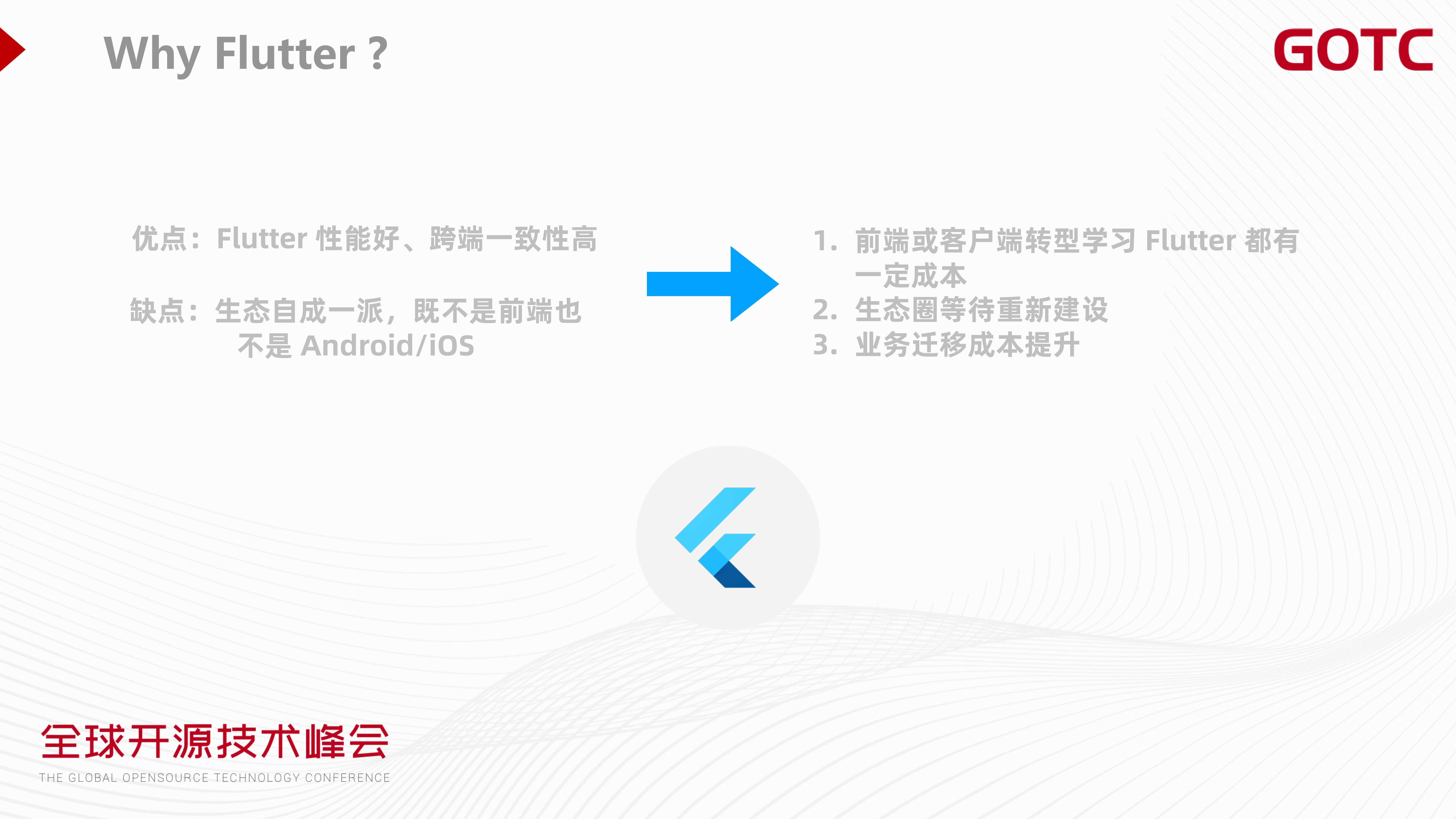 - 其次,生态圈等待重新建设,一些 Flutter 开发者朋友或许觉得目前 Flutter 开发已经有挺多的 pub 可以直接使用了。但实际上生态圈不止于 Flutter pub,还有各种已有的基础链路,比如建设相关的 CI/CD,再比如搭建等等。这一系列的生态都需要重新建设,成本是非常大的。