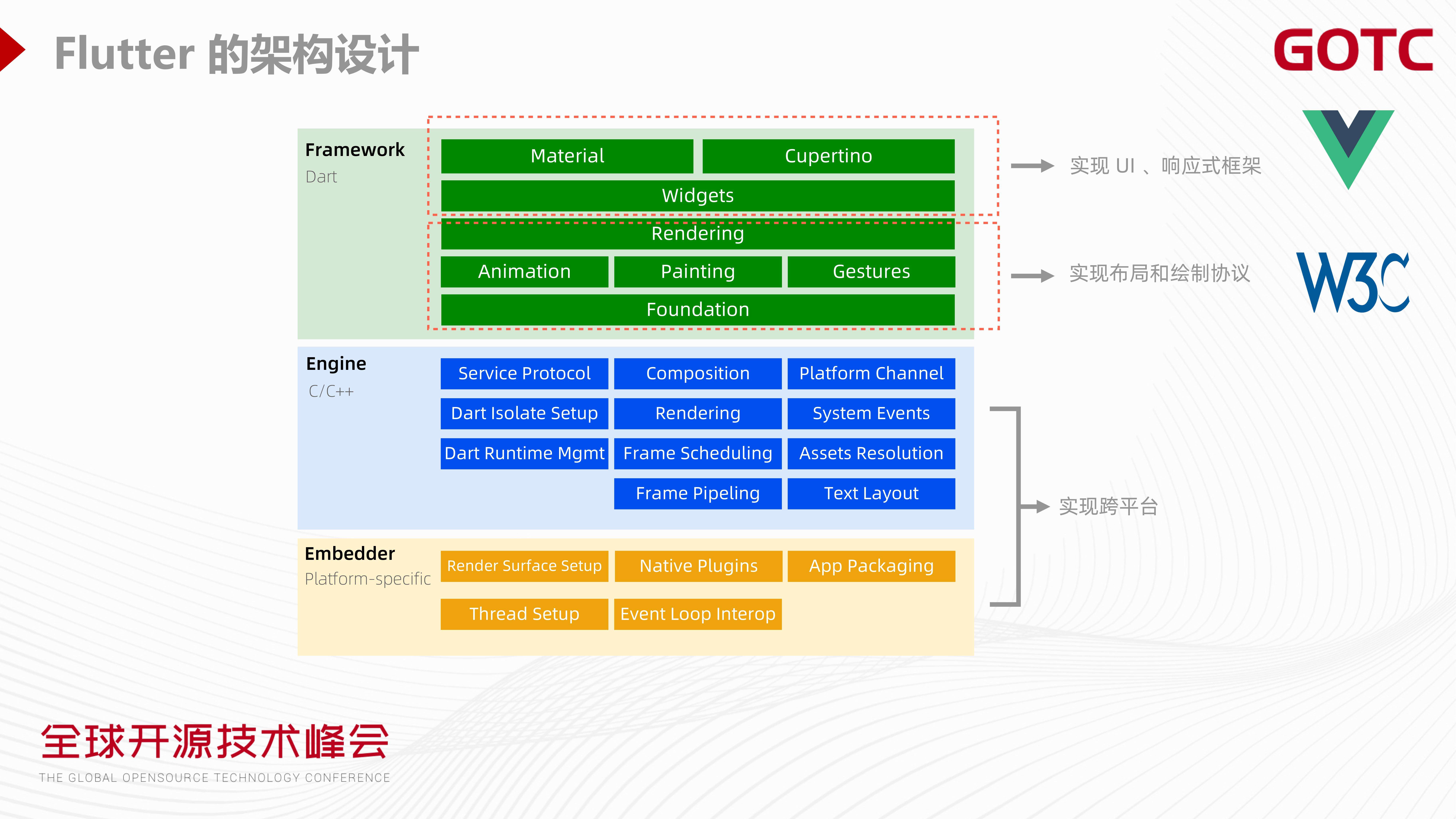 不难发现,最 Dart Framework 的 Widget 是对 UI 的抽象,实现了一套响应式框架,对应到前端就是 Vue / React 等前端框架。而下方的布局协议,可以对应 W3C 的标准来实现一套基于前端标准的布局与绘制协议。