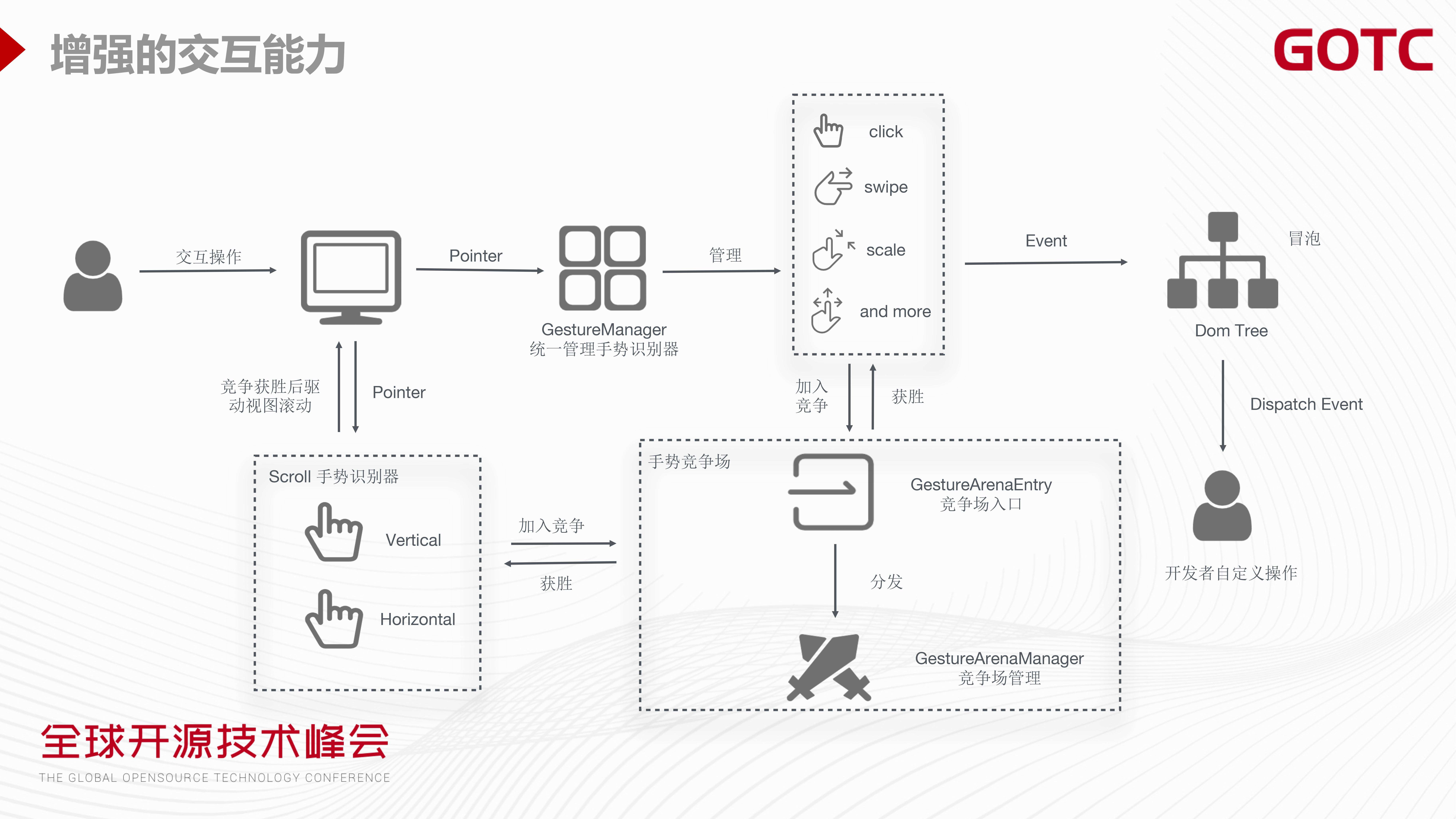 下面是 Kraken 中增强交互能力的流程图。当用户进行某些交互操作以后,每一个触点的 pointer 会从 Native 传递到 Kraken 中,Pointer 会同时分发给 GestureManager(手势识别器管理类)以及 Scroll 识别器。GestureManager 会识别开发者通过 Web 标准的监听行为(EventTarget.addEventListener)来注册以及分发给对应的手势识别器,同样 Scroll 识别器也会被分发 pointer。这些识别器被加入到 Flutter 的竞争场进行手势竞争,以保证只触发某一个具体操作(交互可控)。Scroll 识别器会触发滚动区域的滚动操作,手势识别器则会通过标准的 Web 流程进行冒泡以及 dispatch,最终开发者通过监听事件完成自定义行为。