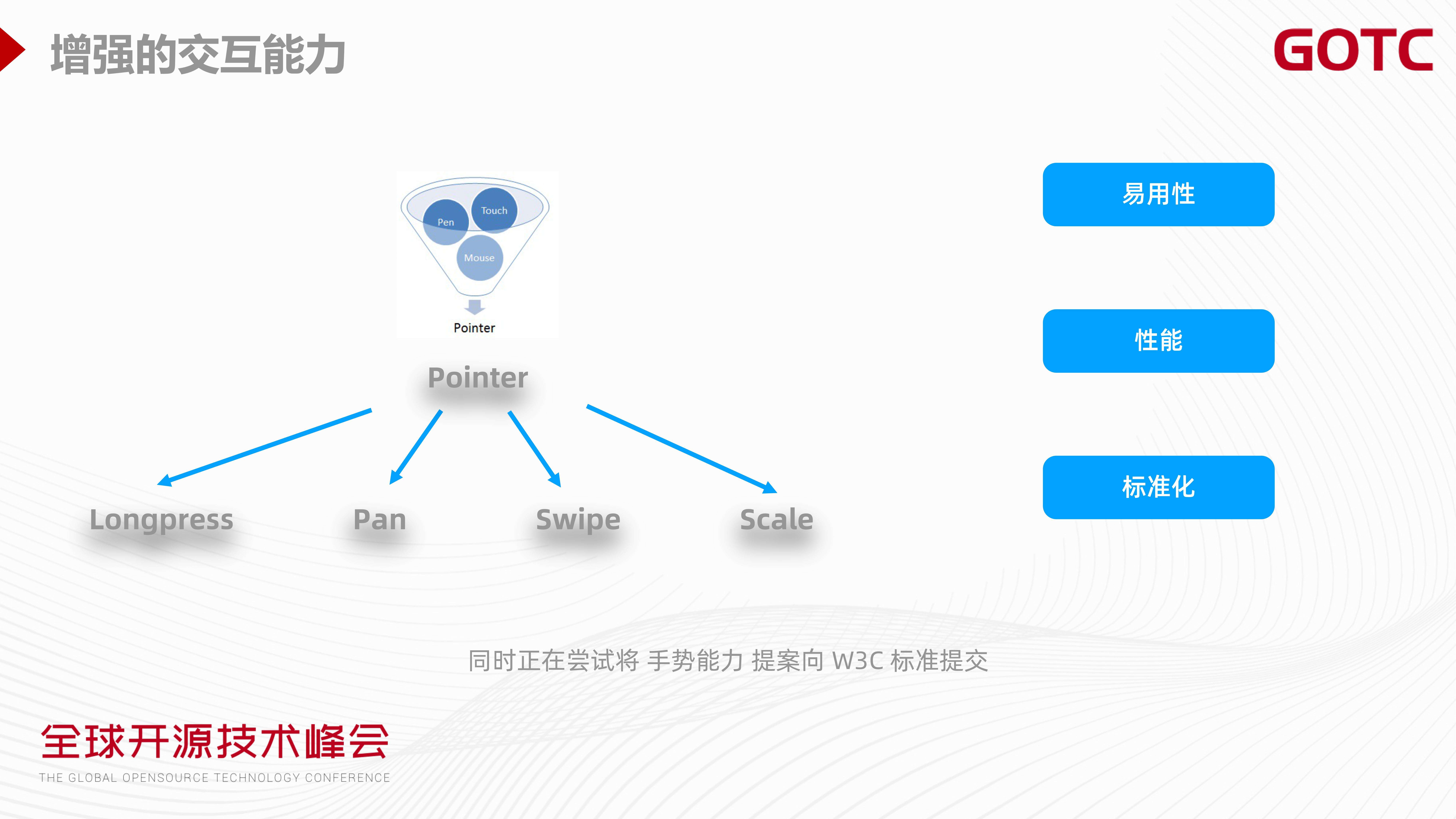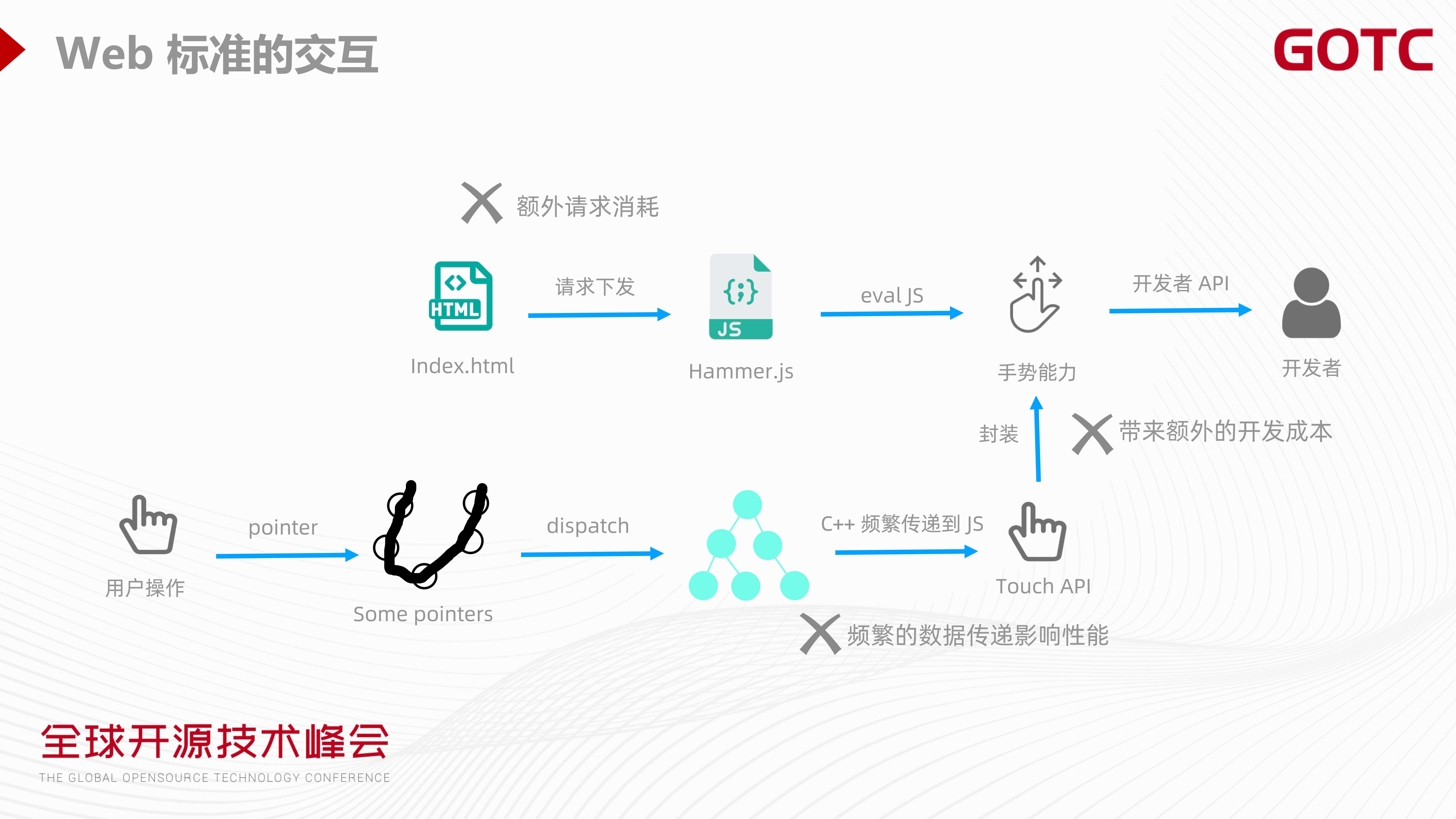 在 Web 中,需要将这一系列 pointer 给 dispatch 到 element tree 上,通过冒泡将这些 pointer 频繁地发送到 JS 层,然后 JS 再通过封装 Touch API 来完成对交互的识别。这样做带来几个问题,首先频繁地将 pointer 从 C++ 传递到 JS 带来了不必要的开销,此外封装标准的能力也会造成额外的开发成本,易用性并不突出。此时,如果使用社区的一些方案,也会导致非标准化使标准不对齐导致同个应用中的不同页面有不一致的交互体验。