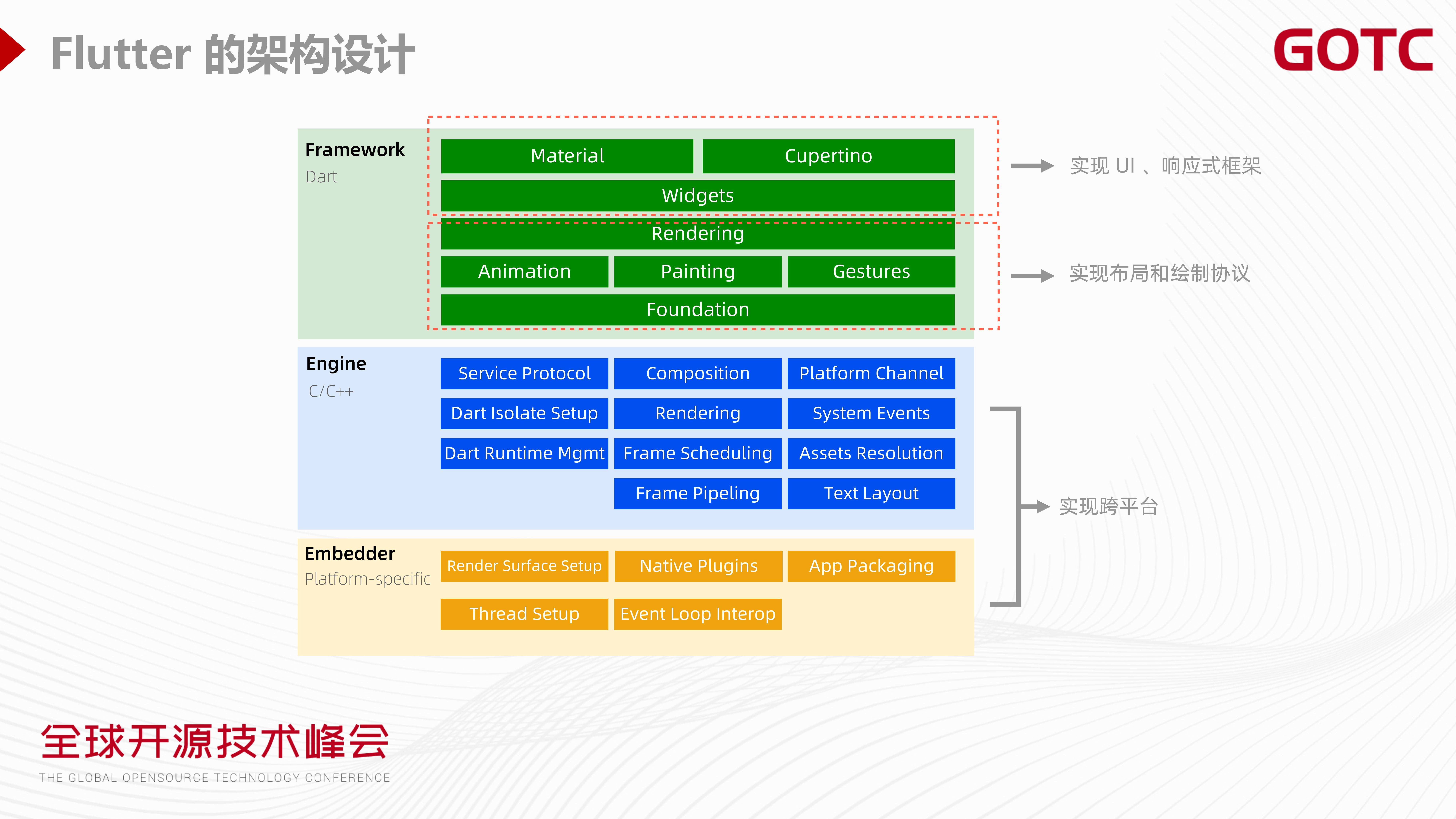 Flutter 最上层是 Dart 实现的 Framework,包含了响应式框架、官网组件库以及实现布局与绘制协议的部分。中间是 C++ 实现的 Flutter Engine,他是渲染流程的下半部分,提供了一些基础能力,以及将 layer 合成以及光栅化后输出。最下层的 Embedder 层,则负责具体 platform 的一些实现,以实现跨平台。
