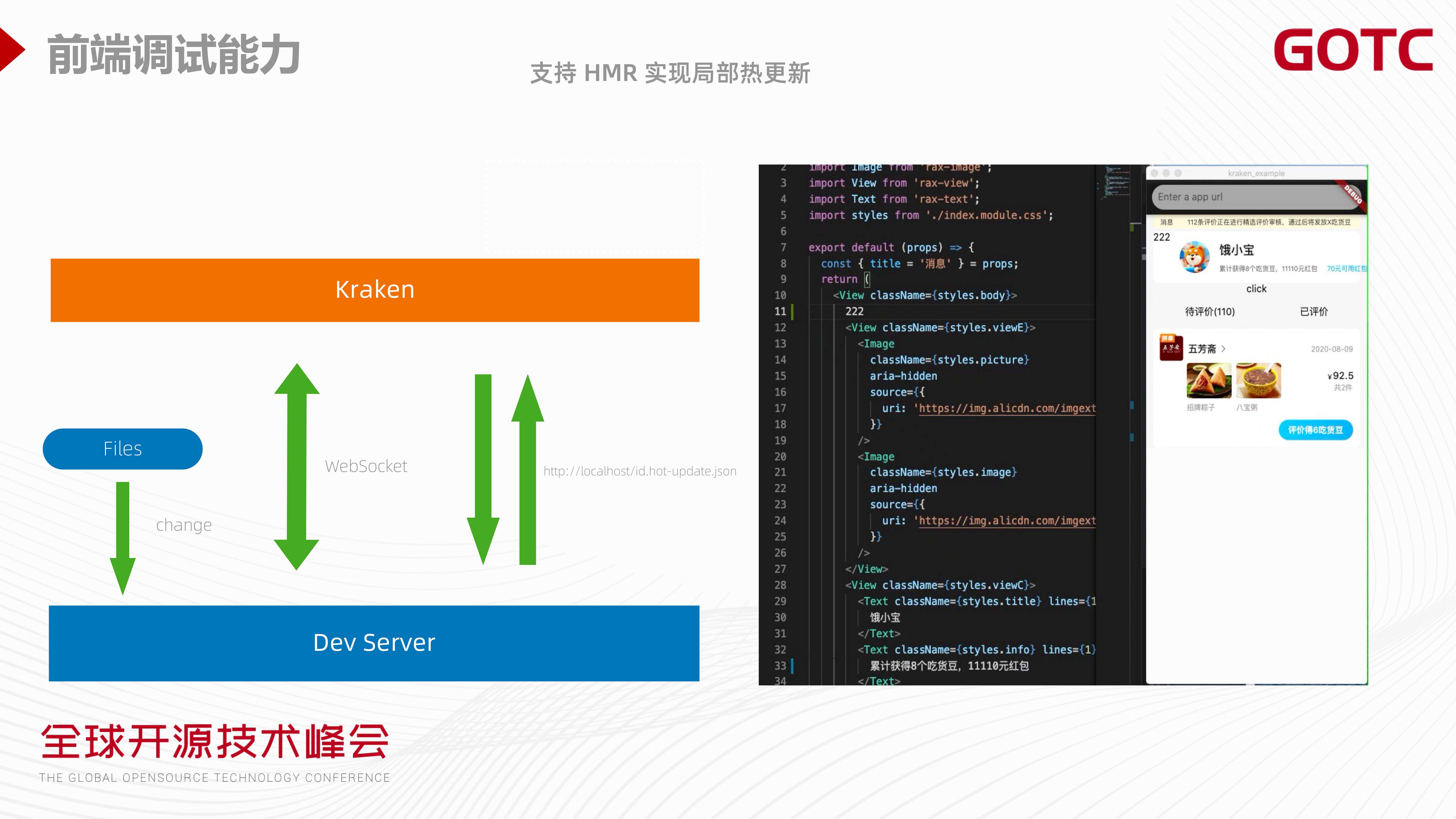 此外,Kraken 也通过支持 HMR 的所有标准的 Web API,来提供局部热更新的能力,使开发 Kraken 应用能跟 Web 下一致的局部热更新的调试体验,大大提升了开发者的开发调试体验。