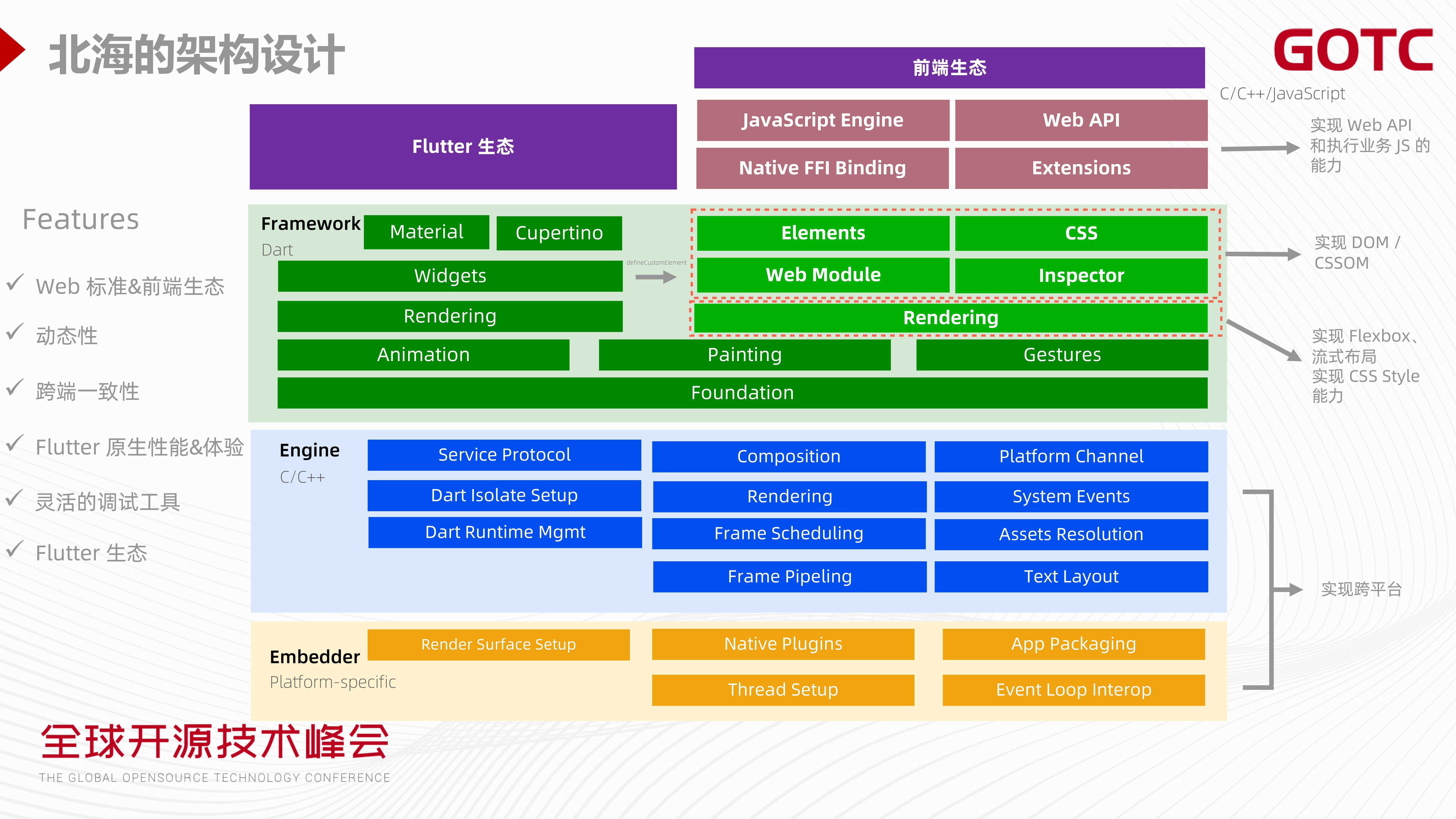 先看左边,左边还是上面介绍的 Flutter 的整体架构,Flutter 的 Widget 能力可以通过插件的形式注册到 Kraken 中去,成为一个前端标准的 Tag,JS 可以动态化地调用及控制渲染。整个左侧的 Flutter 架构支撑了上层的 Flutter 生态,使 Flutter 生态也可以通过插件的形式融合到整个 Kraken 的渲染体系中去。