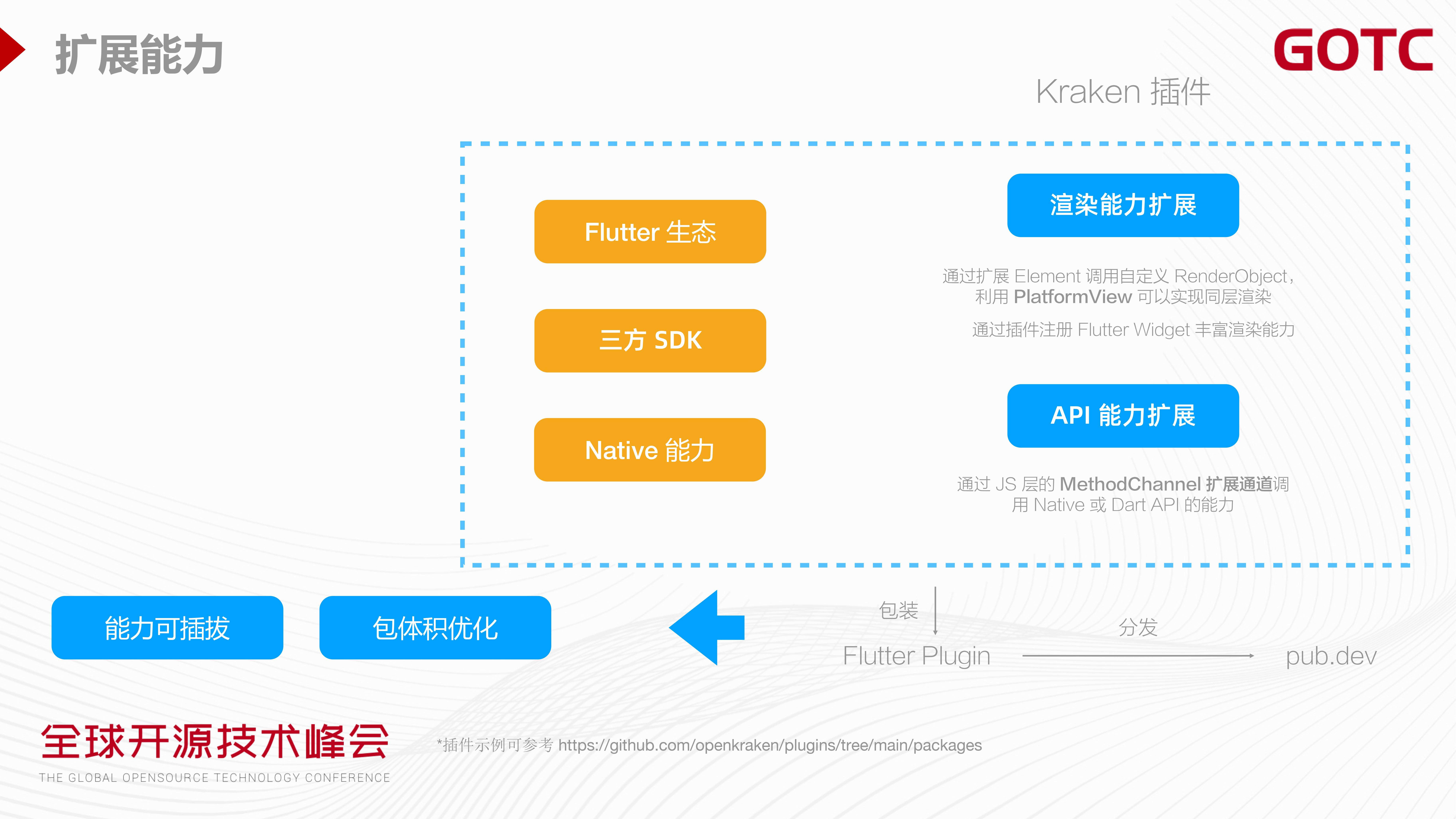 开发者可以通过扩展能力自定义业务域需要的能力,按需拔插以达到包体积优化的目的。同样的,注册到 kraken 的插件都可以通过 JavaScript 代码控制,提供了动态性。