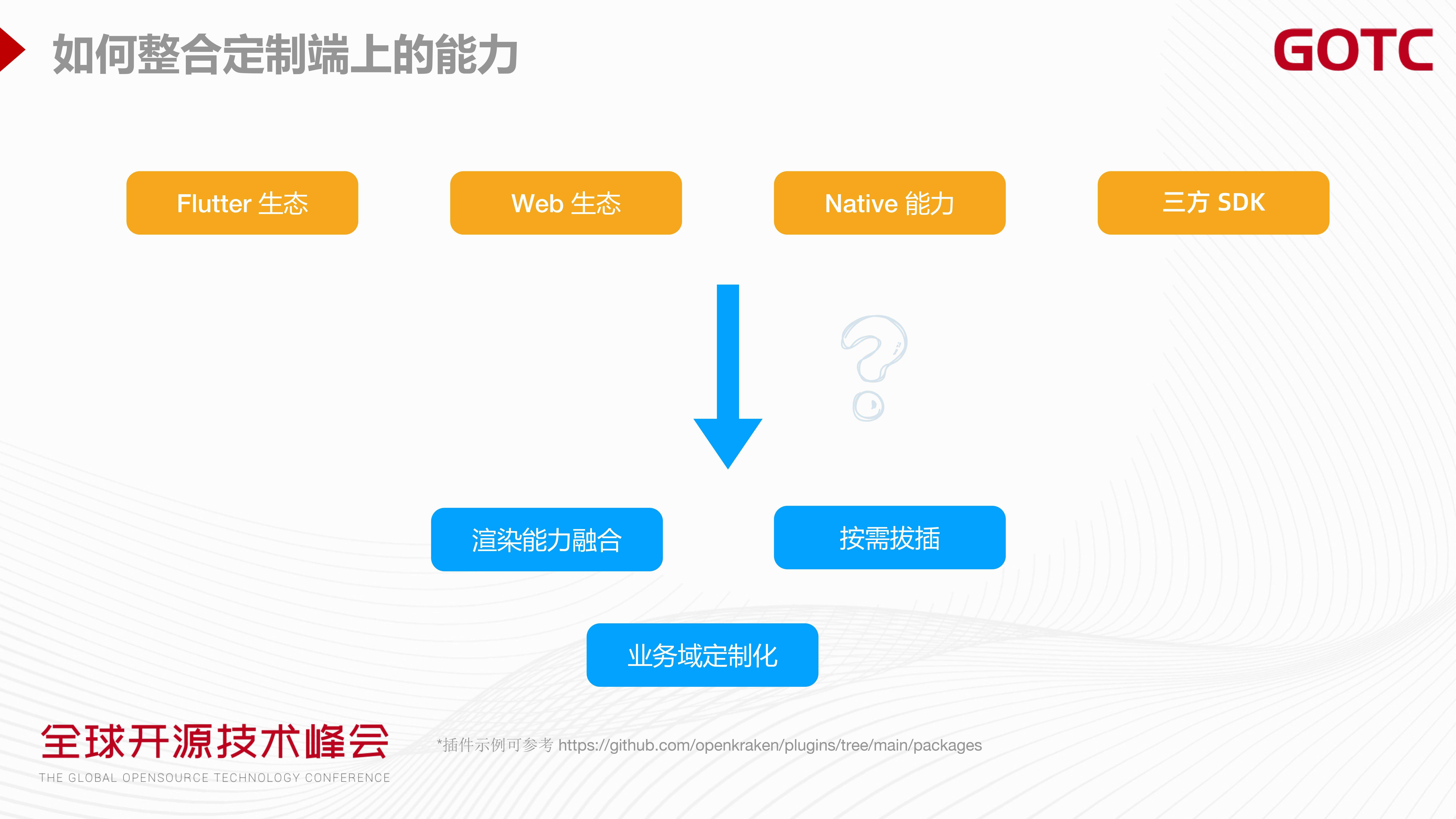 一个大前端团队往往既有客户端也有前端,会沉淀一系列的端上的能力。不同的需求会有不一样的技术选型,譬如说一个播放器往往是通过 Native 技术去开发的。我们期望将端上的能力(包括 Flutter Widget、Web、Native 以及三方 SDK 等)进行整合,融合成一个大前端的端开发体系,所以在 Kraken 内我们如何整合端上的这一系列能力呢?同时,我们也期望按需引入,能做到包体积的优化。在不同的业务域,我们期望可以快速地进行定制化开发,快速形成一套垂直业务域的领域能力。