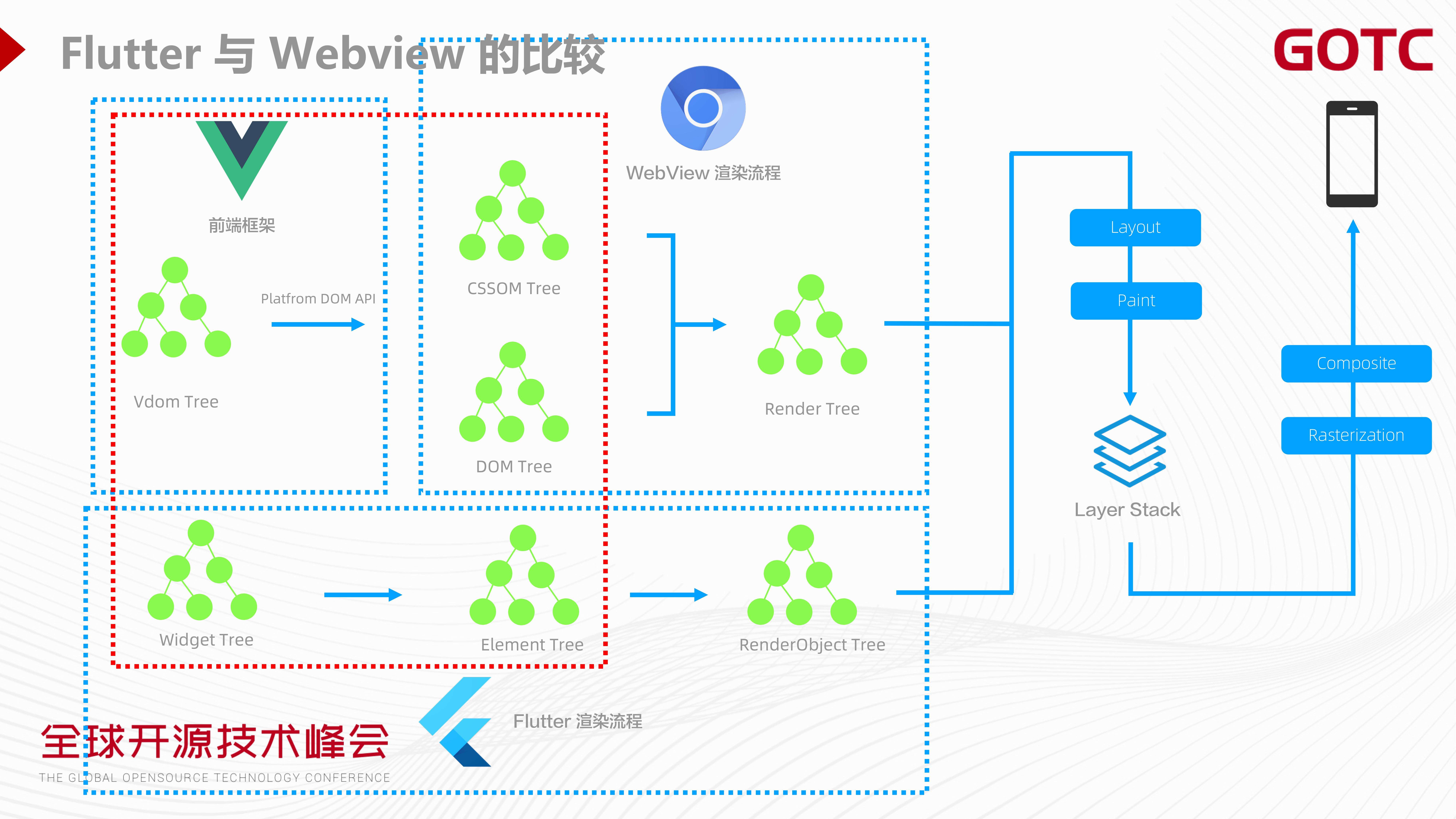那么我们就会发现,只需要把我用红框圈出来的部分的流程进行互换,就可以实现我们最终想要实现的效果(上层 Web 开发,下层基于 Flutter 进行渲染)。