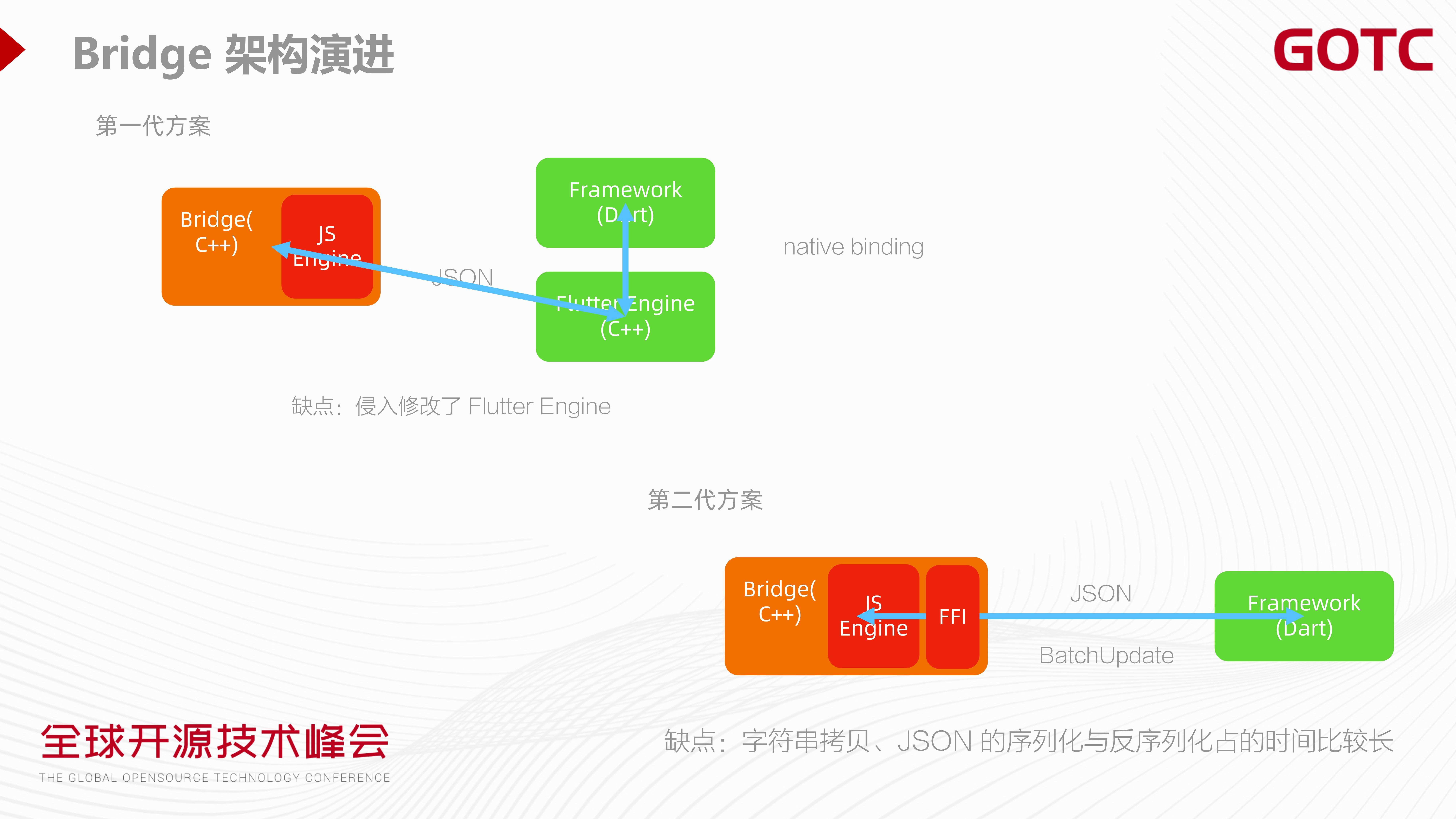 后来出现了 Dart FFI,可以实现 C++ 与 Dart 之间的高效通信,所以产生了第二代方案。第二代 Bridge 方案通过将 JSON 数据序列化后,通过 Dart FFI 将数据传递到 Dart 层,Dart 层再通过 JSON 的反序列化以拿到最终的数据。这代方案比起上一代方案可以解决侵入 Flutter Engine 的缺点,但是引入了字符串的拷贝以及 JSON 序列化反序列化的时间长的问题。