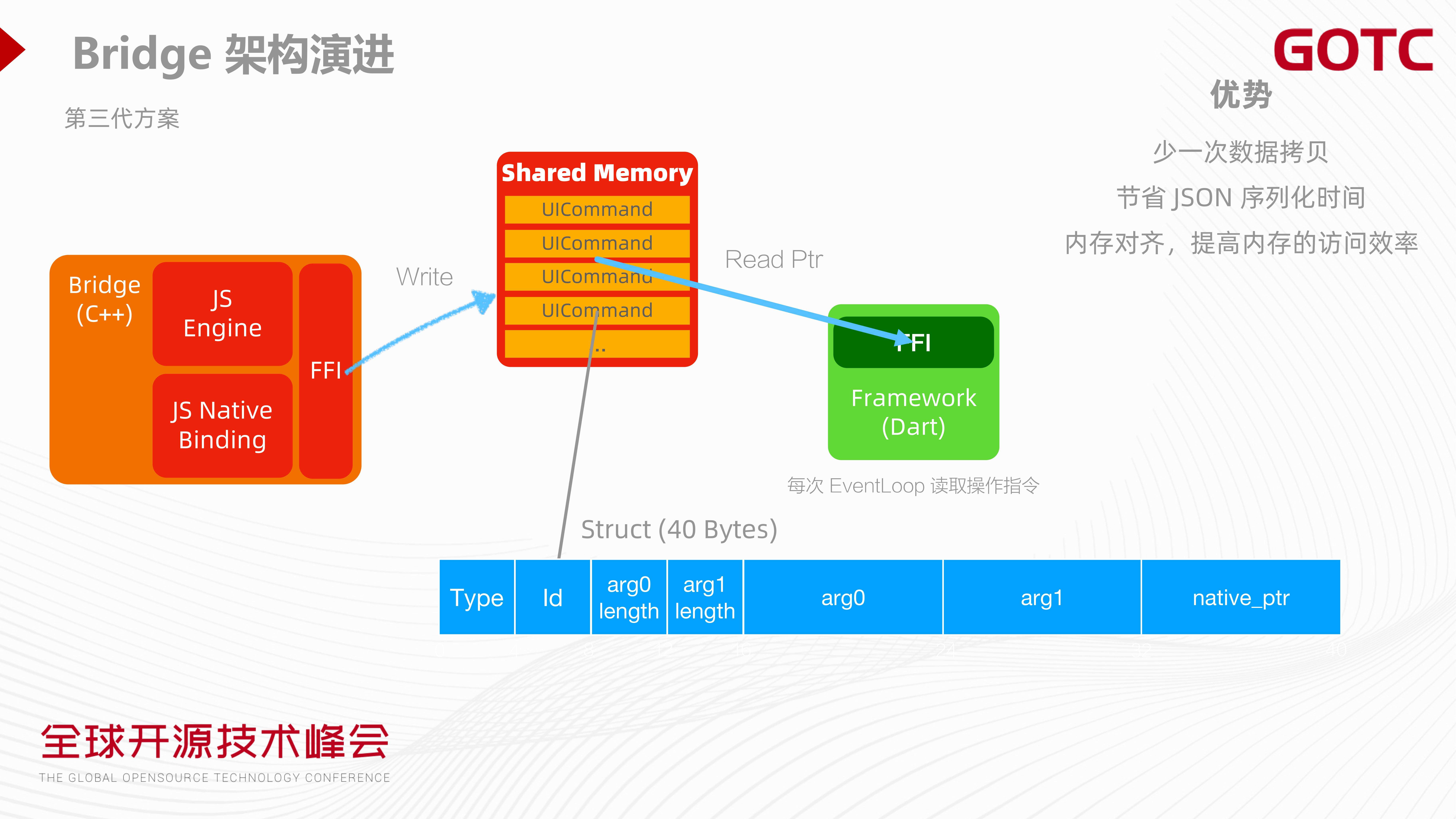 为了解决上述问题,于是产生了第三代 Bridge 方案。第三代 Bridge 方案通过共享内存的方式定义了一个标准的 40 Bytes 的 Struct 来存储指令,而通过 Dart FFI 传递的只是指令的地址,C++ 跟 Dart 两边都依赖地址来访问相关数据。这样做解决了 JSON 序列化反序列化的问题,节约了时间,并且少一次数据拷贝。同时,由于内存是 40 Bytes 对齐的,可以提高内存的访问效率。