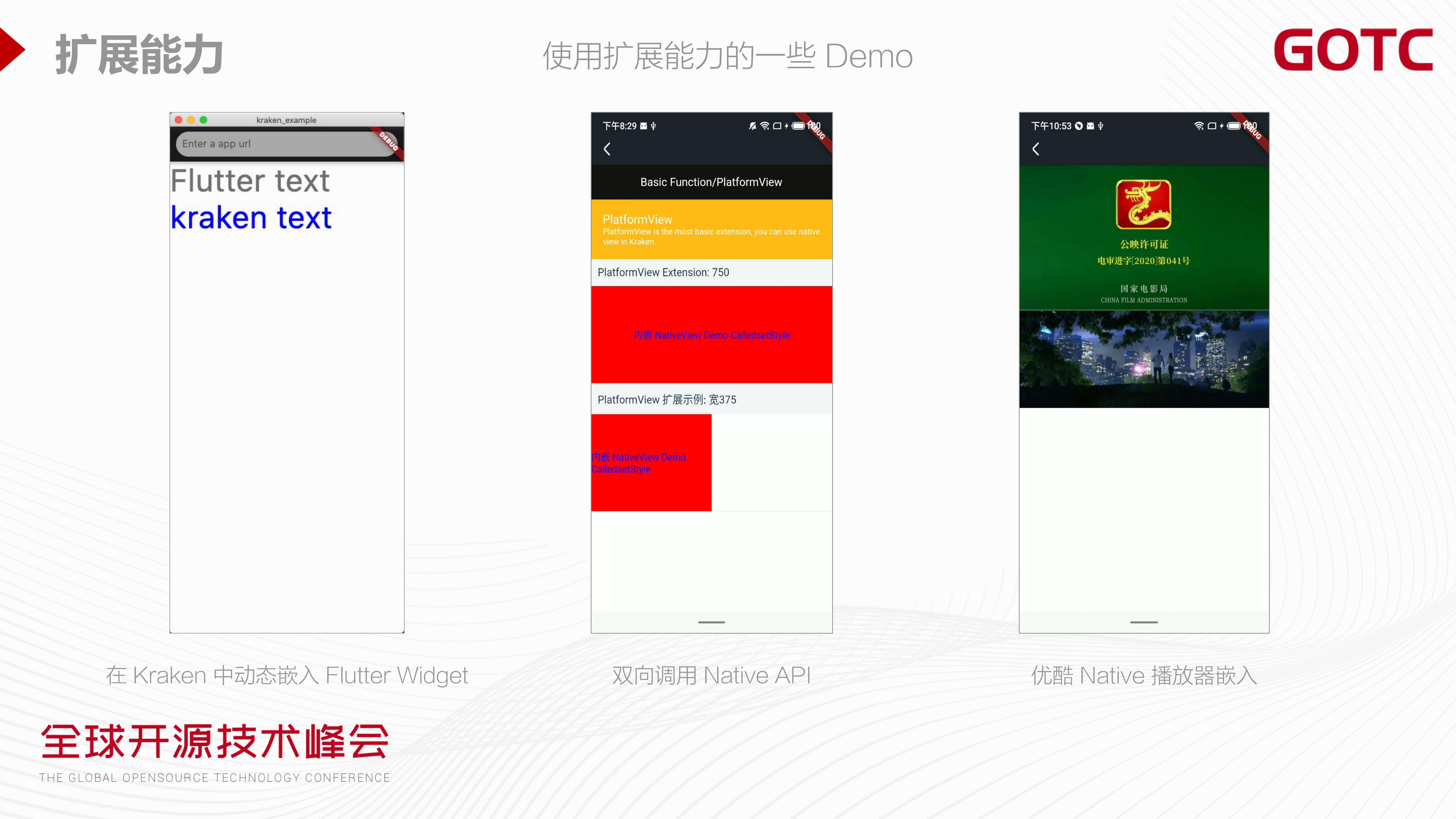 下面是一系列在 Kraken 内部扩展 Flutter Widget、Native API 以及 Native 播放器的 Demo。