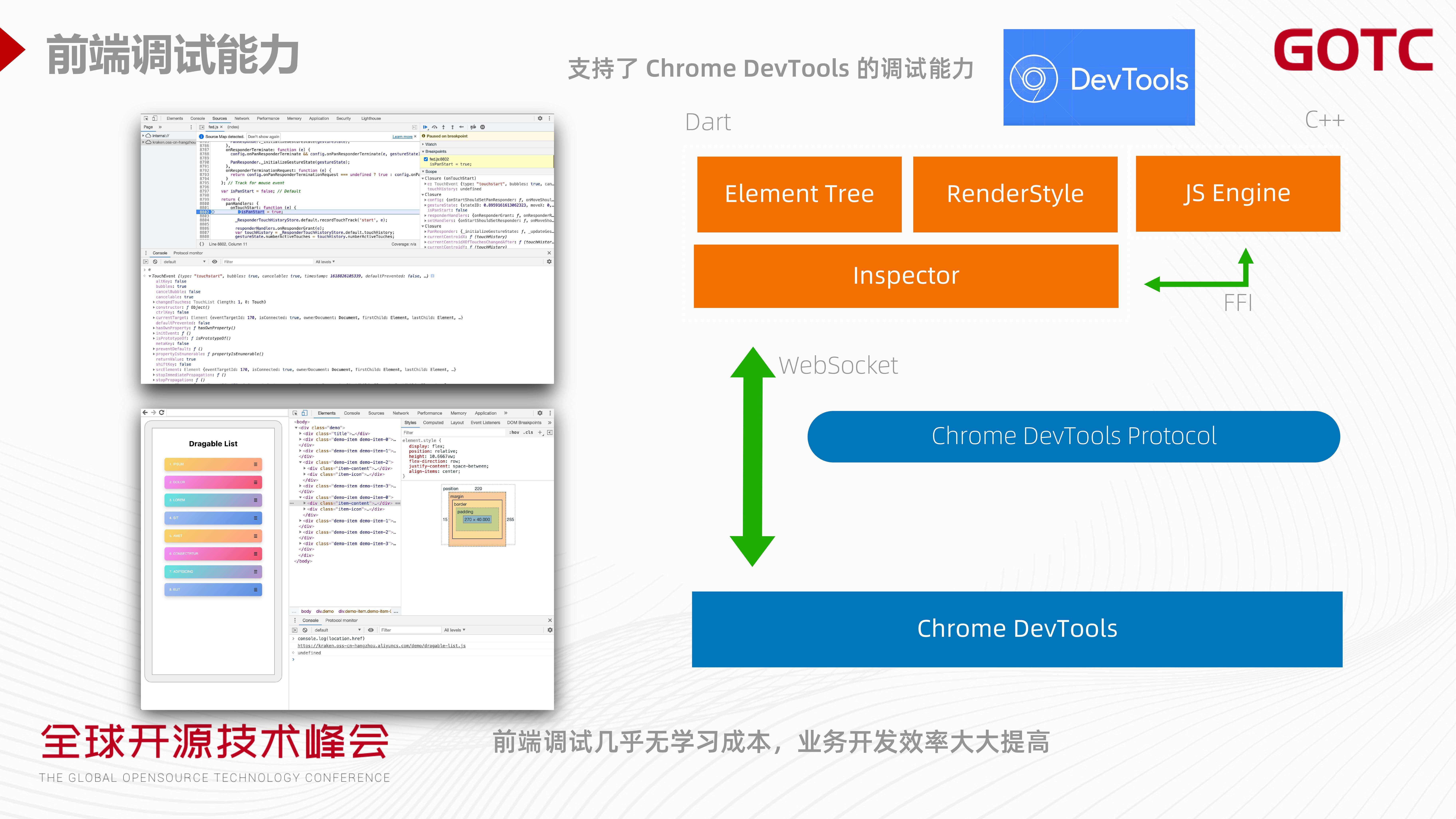 右边是 Kraken 的架构实现,Kraken 的实现并没有把实现侵入到 Flutter Engine 中去。在 Dart 层,通过实现 W3C 标准的一系列布局与渲染能力,为上层提供了一些列标准化的能力,比如 Element、CSS、以及各种 Web 标准的 Module 等。在上层 Kraken 的 runtime 通过 JS Engine Binding 的方式提供了一系列 Web 标准的 API 接口,调用相应 API 会执行相关逻辑并创建一系列需要发送给 Dart 层处理的指令,指令通过一个 struct 进行存储。C++ 通过 FFI 将相应的指令底层的 address 发送到 Dart 这边,最终 Dart 根据指令调用前面说的标准化能力,以完成对接。通过该实现,为上层的前端生态提供了支撑,凭借丰富的前端生态,开发者可以享受前端生态带来的高效的开发体验。