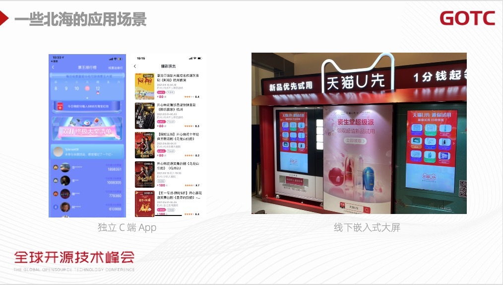 下面我列举了一些北海在阿里的一些应用场景,在 C 端 APP 或者 IoT 设备上,北海都有相关的落地。