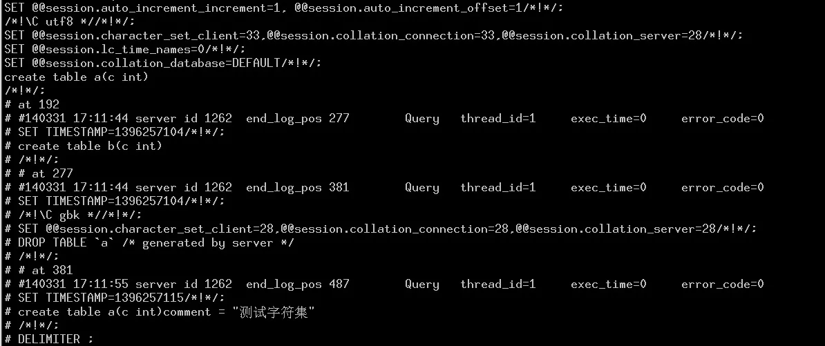 这句话的原始信息中得到当前使用的字符集,那么解析后续的binlog语句就没有问题。可以看到在drop table a之前我们修改了字符集,同样在binlog解析结果中可以看到一个设置字符集的语句。