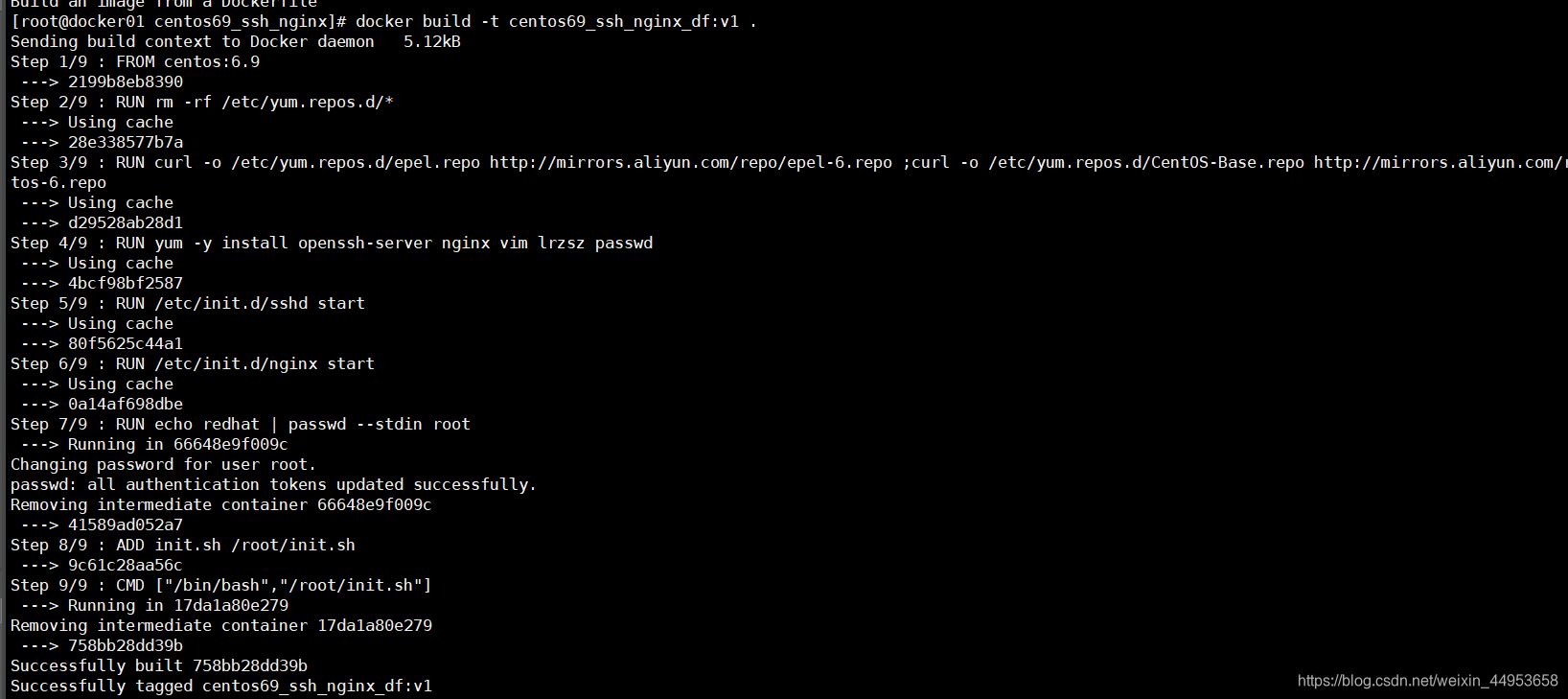 1.创建dockerfile目录 [root@docker01 dockerfile]# mkdir centos69_ssh_nginx [root@docker01 dockerfile]# cd centos69_ssh_nginx 2.编写dockerfile [root@docker01 centos69_ssh_nginx]# vim dockerfile FROM centos:6.9 RUN rm -rf /etc/yum.repos.d/* RUN curl -o /etc/yum.repos.d/epel.repo http://mirrors.aliyun.com/repo/epel-6.repo ;curl -o /etc/yum.repos.d/CentOS-Base.repo http://mirrors.aliyun.com/repo/Centos-6.repo RUN yum -y install openssh-server nginx vim lrzsz passwd RUN /etc/init.d/sshd start RUN /etc/init.d/nginx start RUN echo redhat | passwd --stdin root ADD init.sh /root/init.sh CMD ["/bin/bash","/root/init.sh"] 3.编写启动脚本 [root@docker01 centos69_ssh_nginx]# vim init.sh #!/bin/bash /etc/init.d/sshd start nginx -g 'daemon off;' 4.运行dockerfile自建镜像 [root@docker01 centos69_ssh_nginx]# docker build -t centos69_ssh_nginx_df:v1 . ........ Successfully built 29e8ca789370 Successfully tagged centos69_ssh_nginx_df:v1 5.查看镜像 [root@docker01 centos69_ssh_nginx]# docker images REPOSITORY TAG IMAGE ID CREATED SIZE centos69_ssh_nginx_df v1 29e8ca789370 About a minute ago 488MB 6.运行镜像 [root@docker01 centos69_ssh_nginx]# docker run -d -p 85:80 -p 2022:22 centos69_ssh_nginx_df:v1 ad29713f993190e18104c73d297b2236be9e4ffd327446882e7d5b6f11d7703a 7.检测 [root@docker01 centos69_ssh_nginx]# docker run -d -p 85:80 -p 2022:22 centos69_ssh_nginx_df:v1 a8f9077a126cf2aa0b76944f5082d3f6dbc7e611651c6b809aca783aa633d55d [root@docker01 centos69_ssh_nginx]# curl -I 192.168.81.210:85 HTTP/1.1 200 OK Server: nginx/1.10.3 Date: Thu, 25 Jun 2020 10:39:56 GMT Content-Type: text/html Content-Length: 3698 Last-Modified: Tue, 07 May 2019 06:09:40 GMT Connection: keep-alive ETag: "5cd12124-e72" Accept-Ranges: bytes [root@docker01 centos69_ssh_nginx]# ssh 192.168.81.210 -p2022 root@192.168.81.210's password: [root@a8f9077a126c ~]#