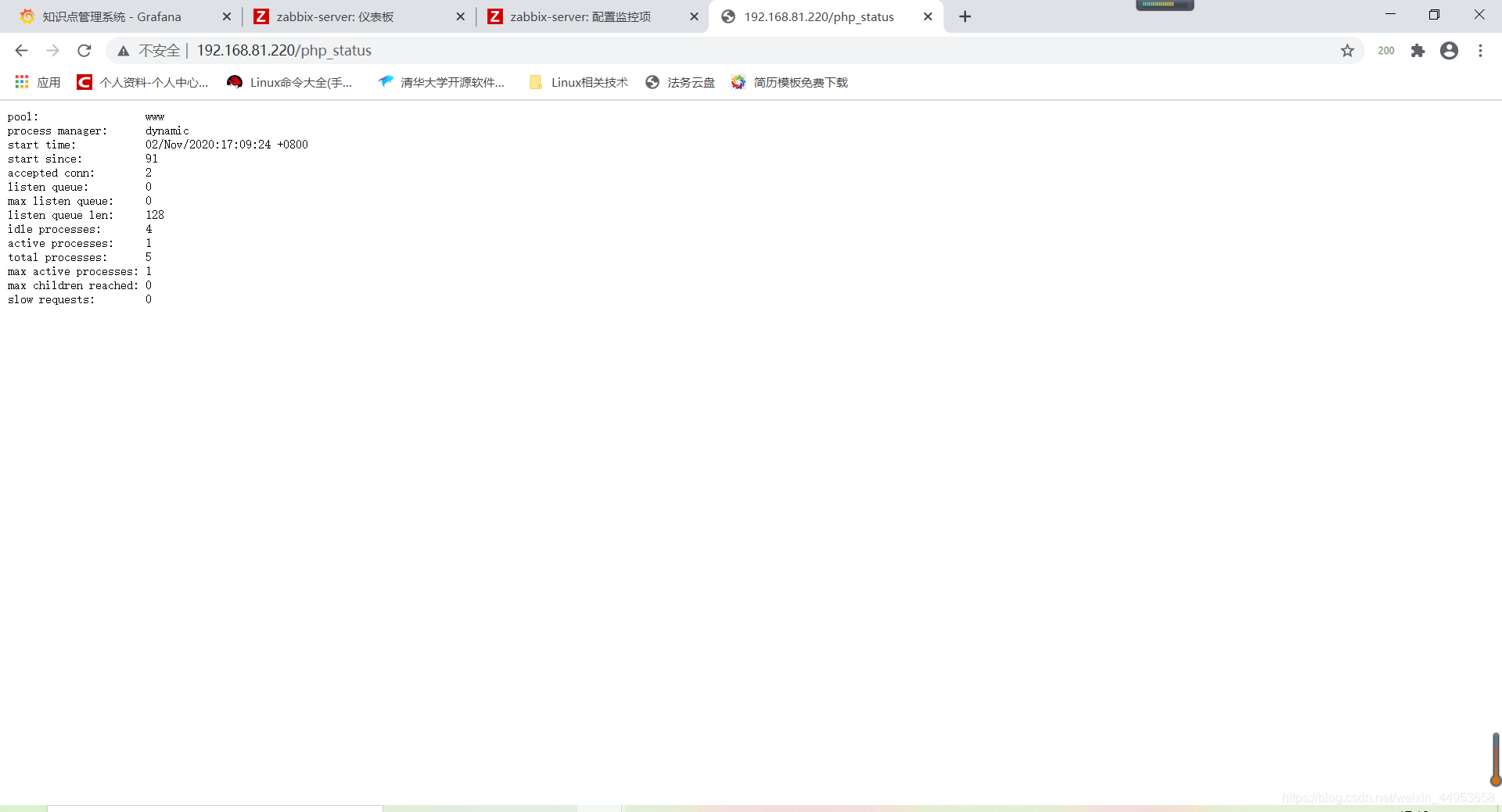 [root@192_168_81_220 ~]# curl 127.0.0.1/php_status pool: www process manager: dynamic start time: 02/Nov/2020:17:09:24 +0800 start since: 39 accepted conn: 1 listen queue: 0 max listen queue: 0 listen queue len: 128 idle processes: 4 active processes: 1 total processes: 5 max active processes: 1 max children reached: 0 slow requests: 0