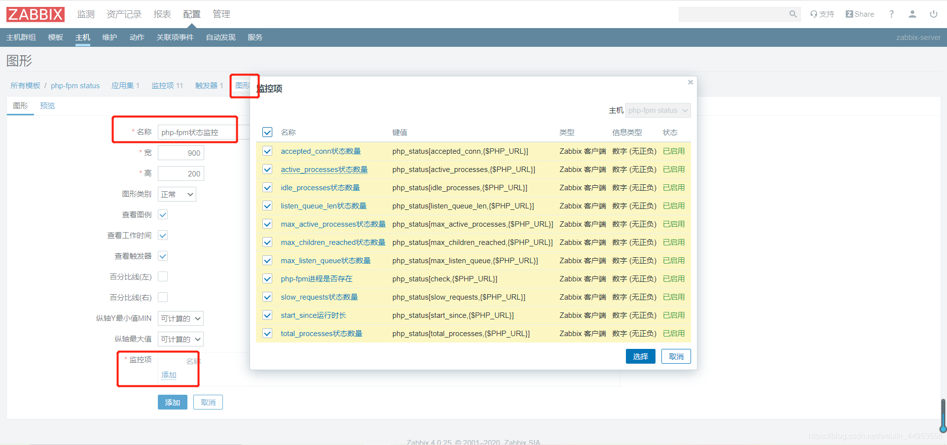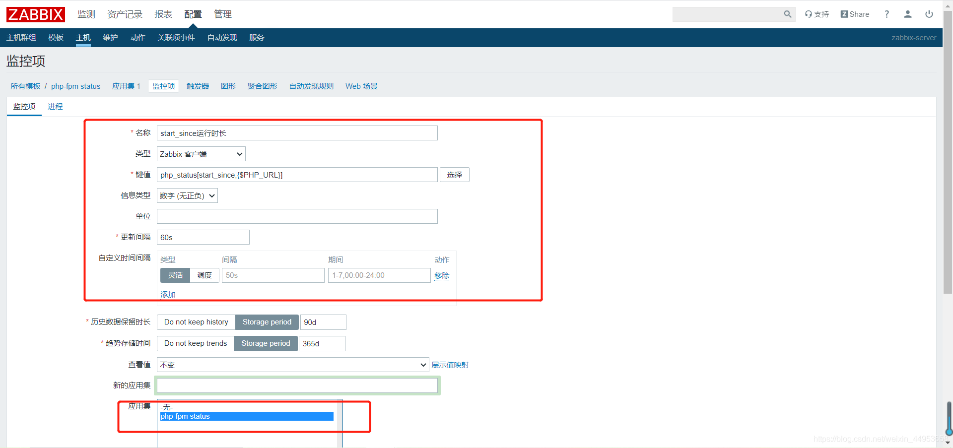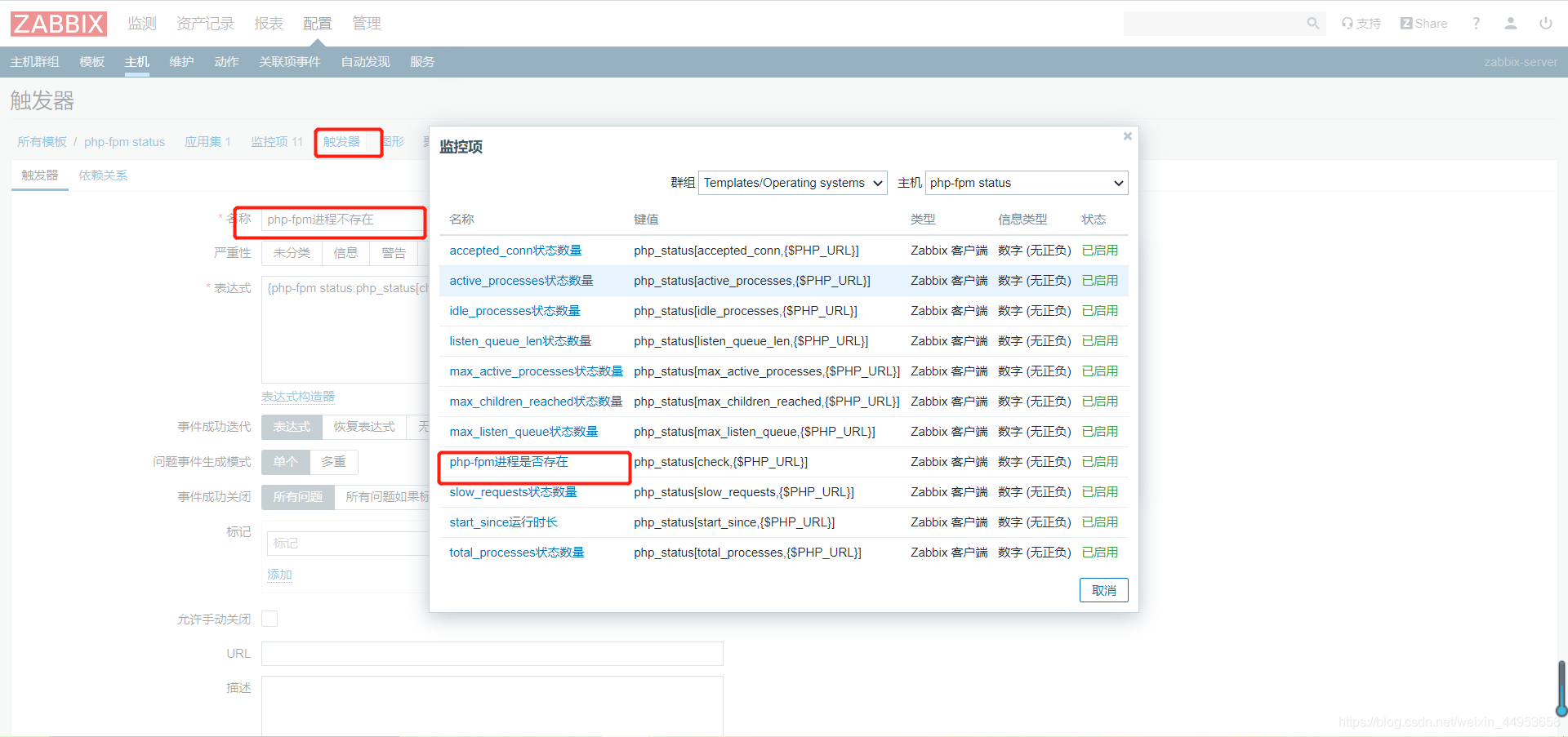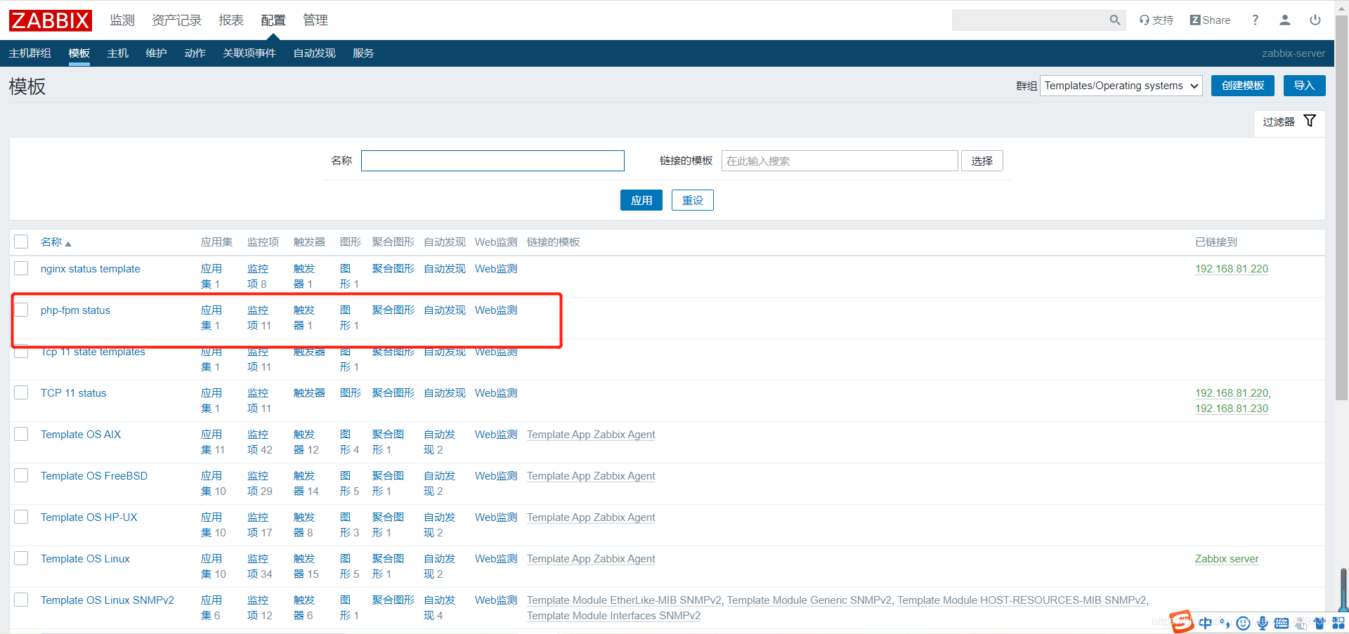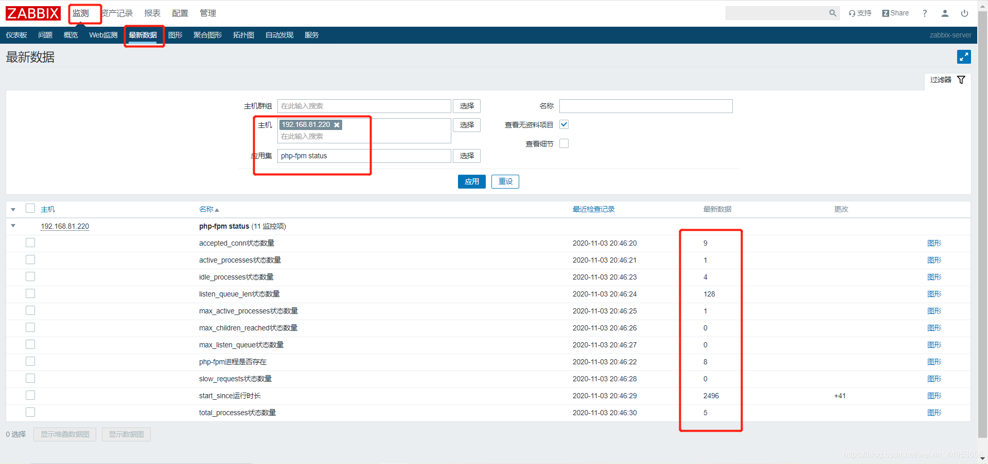 [root@192_168_81_220 ~]# cat /etc/zabbix/zabbix_agentd.d/php-fpm.conf UserParameter=php_status[*],/bin/bash /etc/zabbix/scripts/php-fpm_status.sh $1 $2 [root@192_168_81_220 ~]# systemctl restart zabbix-agent zabbix-server测试 [root@zabbix-server ~]# zabbix_get -s 192.168.81.220 -k php_status[max_active_processes,http://192.168.81.220/php_status] 1