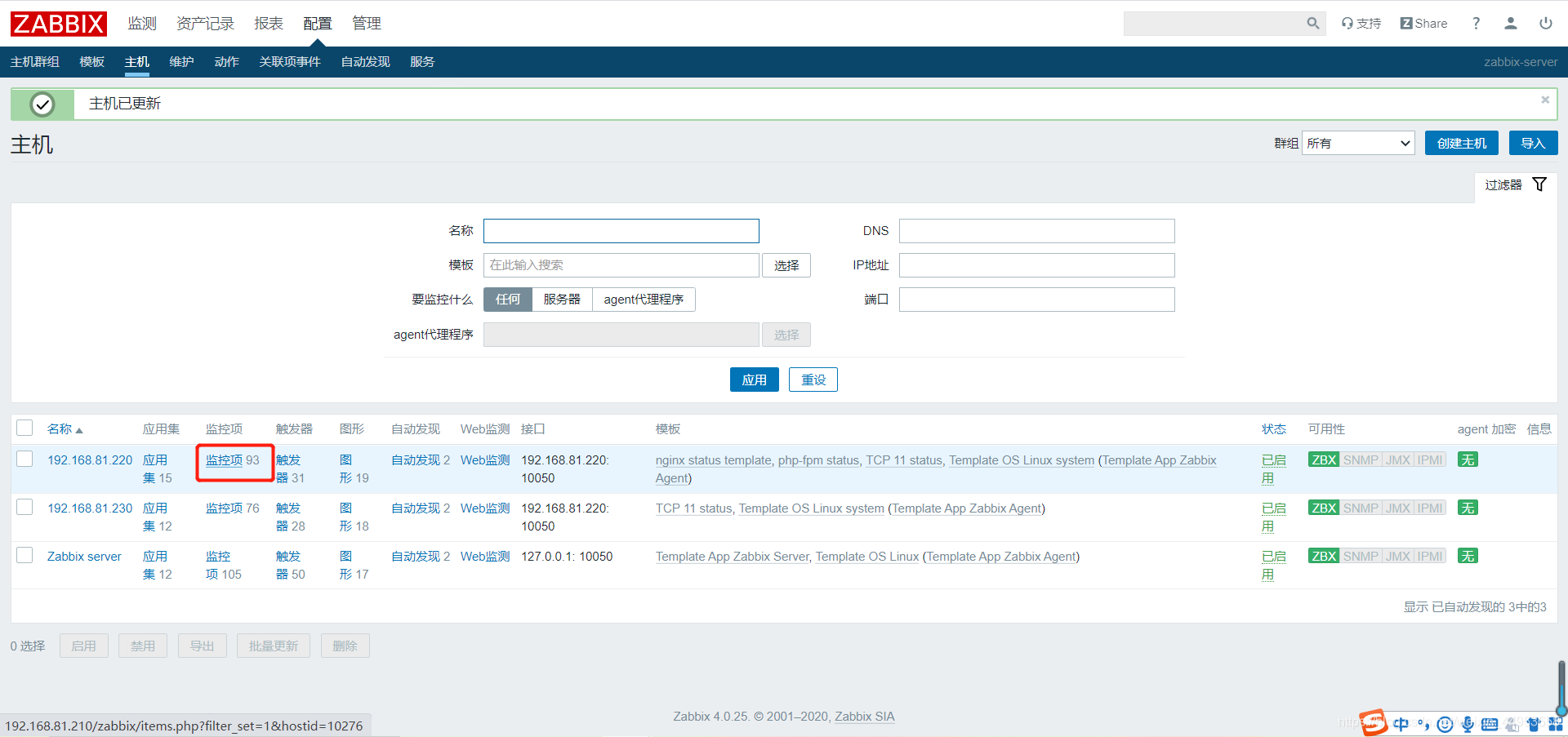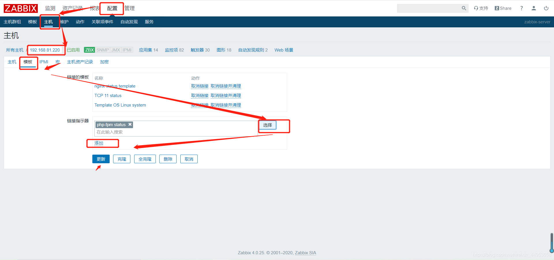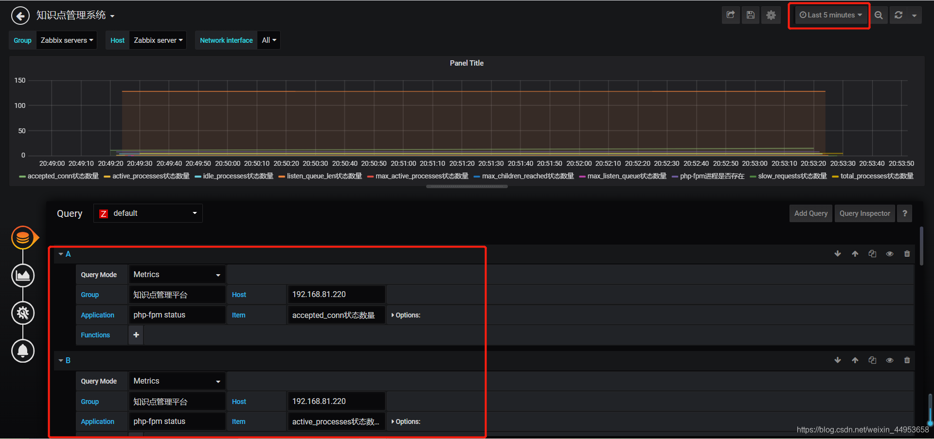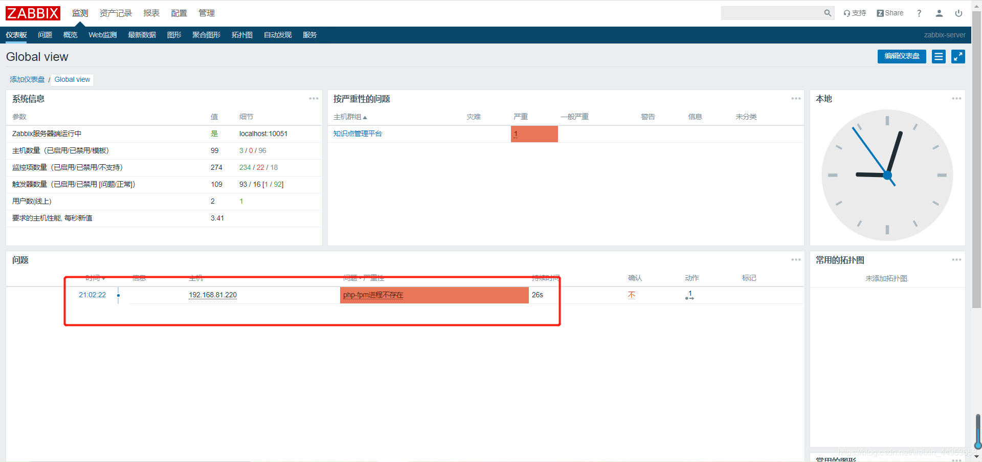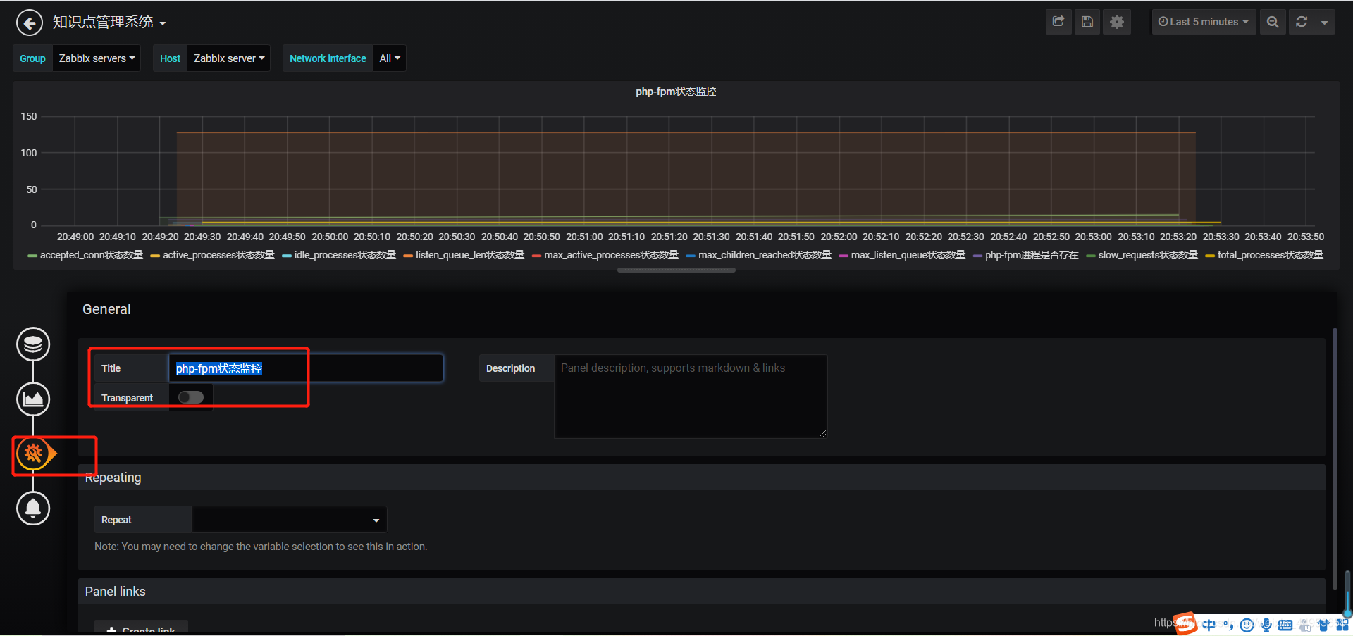 [root@192_168_81_220 ~]# cat /etc/zabbix/zabbix_agentd.d/php-fpm.conf UserParameter=php_status[*],/bin/bash /etc/zabbix/scripts/php-fpm_status.sh $1 $2 [root@192_168_81_220 ~]# systemctl restart zabbix-agent zabbix-server测试 [root@zabbix-server ~]# zabbix_get -s 192.168.81.220 -k php_status[max_active_processes,http://192.168.81.220/php_status] 1