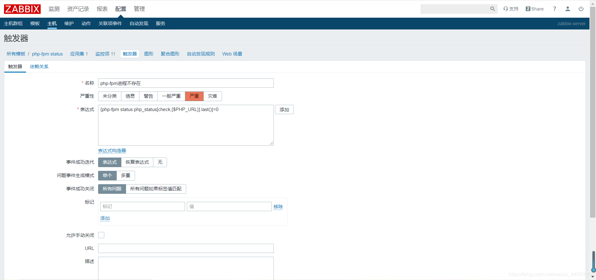 最后监测进程是否存活可以通过ps查到进程然后通过wc -l获取数量,最后echo这个值,然后创建触发器,最新值等于0就表示进程不存在