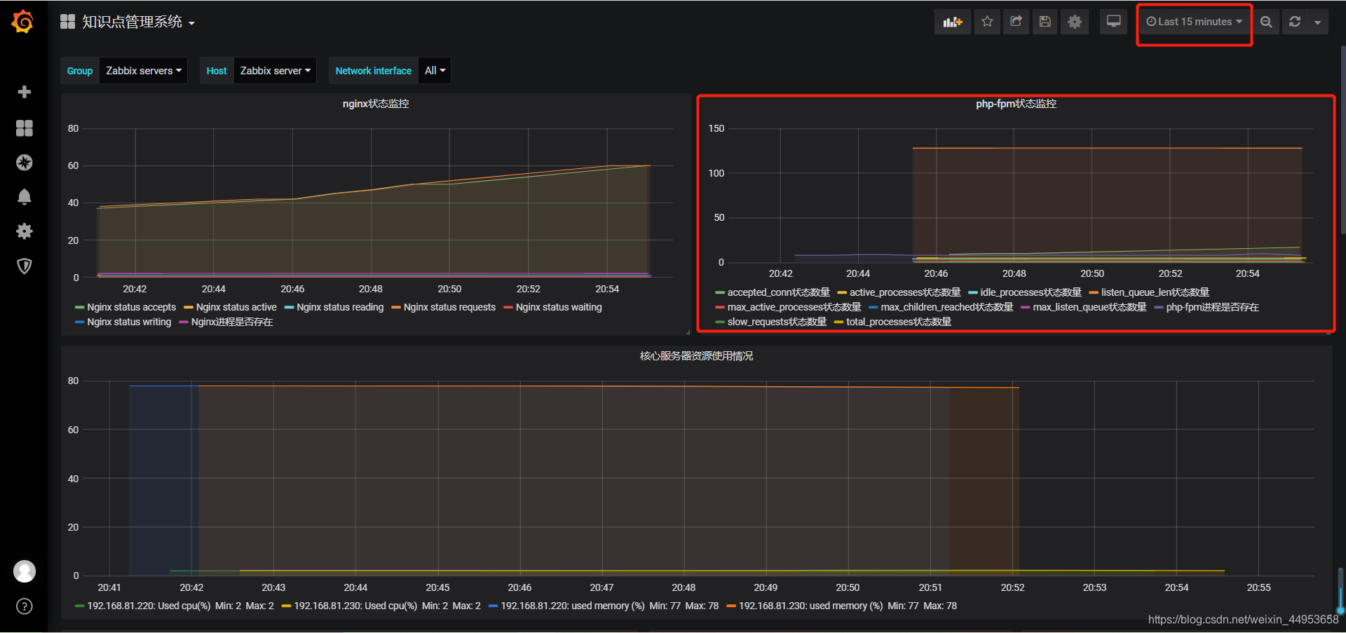 1.开启php-fpm状态监控 [root@192_168_81_220 ~]# vim /etc/php-fpm.d/www.conf pm.status_path = /php_status 2.配置nginx连接php-fpm [root@192_168_81_220 ~]# vim /etc/nginx/nginx.conf location /php_status { fastcgi_pass 127.0.0.1:9000; fastcgi_index index.php; fastcgi_param SCRIPT_FILENAME $document_root$fastcgi_script_name; include fastcgi_params; } 3.重启服务 [root@192_168_81_220 ~]# systemctl restart nginx [root@192_168_81_220 ~]# systemctl restart php-fpm