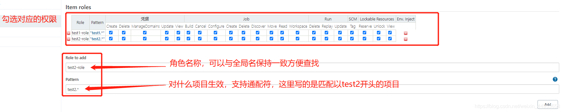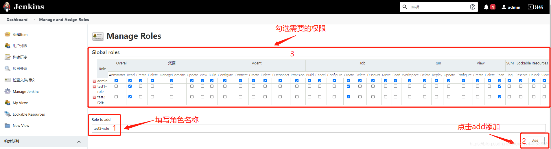 在role to add中填写角色的名称,然后勾选对应的权限即可