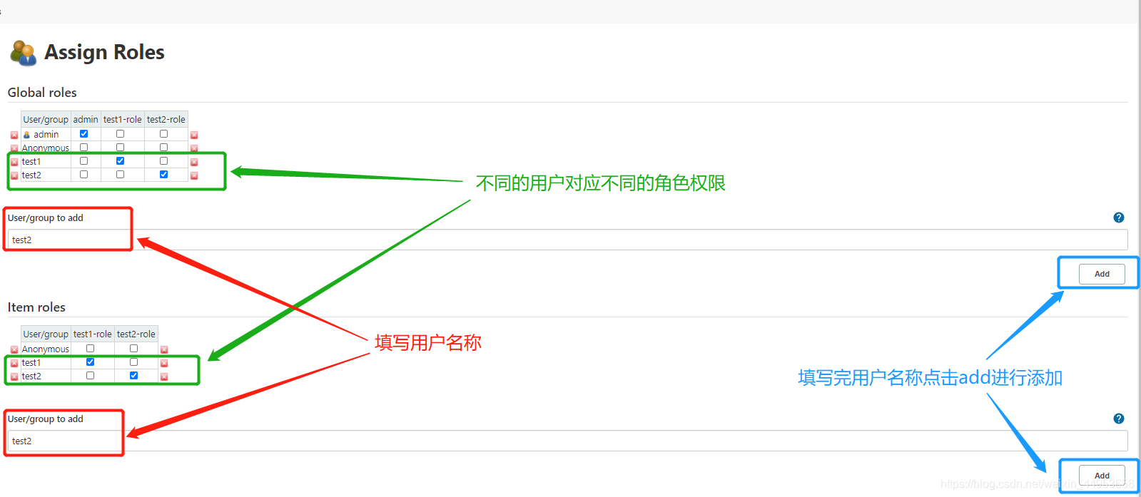 在 User/group to add 输入用户的名称点击add即可添加用户,然后根据不同的用户勾选不同的角色对应,全局角色和项目角色都需要添加,最后点击保存