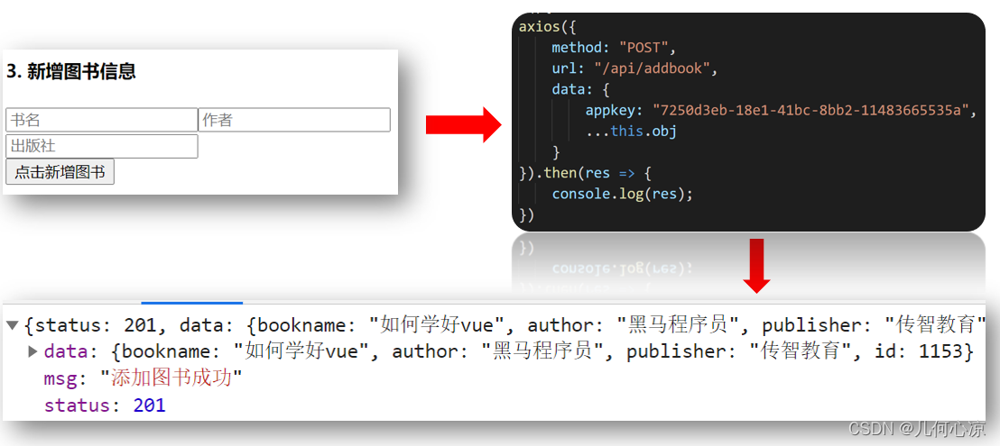 axios({ method: '请求方式', // get post url: '请求地址', data: { // 拼接到请求体的参数, post请求的参数 xxx: xxx, }, params: { // 拼接到请求行的参数, get请求的参数 xxx: xxx } }).then(res => { console.log(res.data) // 后台返回的结果 }).catch(err => { console.log(err) // 后台报错返回 })