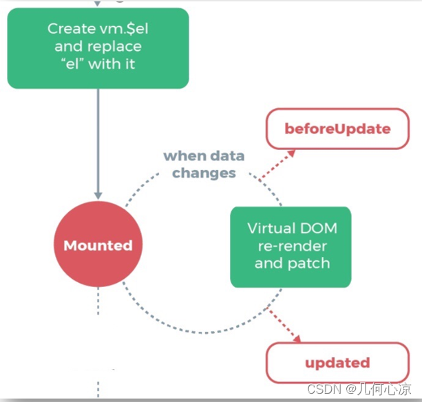 数据更新时调用,发生在虚拟 DOM 打补丁之前。这里适合在更新之前访问现有的 DOM,比如手动移除已添加的事件监听器。该钩子在服务器端渲染期间不被调用,因为只有初次渲染会在服务端进行。