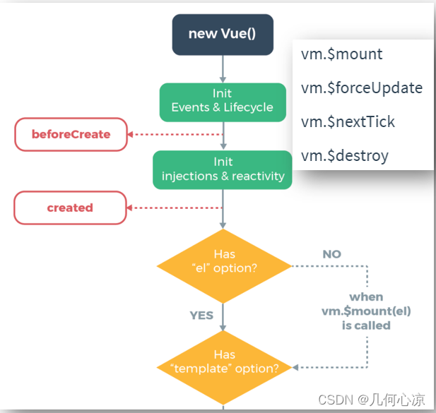 <script> export default { data(){ return { msg: "hello, Vue" } }, // 一. 初始化 // new Vue()以后, vue内部给实例对象添加了一些属性和方法, data和methods初始化"之前" beforeCreate(){ console.log("beforeCreate -- 执行"); console.log(this.msg); // undefined }, // data和methods初始化以后 // 场景: 网络请求, 注册全局事件 created(){ console.log("created -- 执行"); console.log(this.msg); // hello, Vue this.timer = setInterval(() => { console.log("哈哈哈"); }, 1000) } } </script>