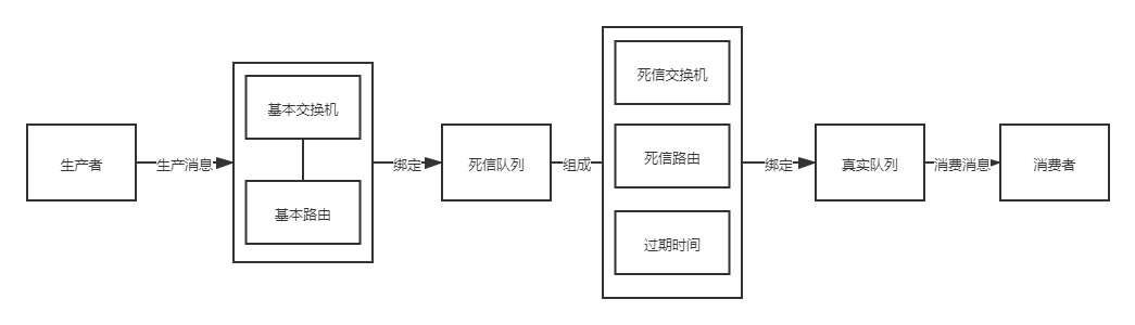 剩下的操作和图中的流程一样,基本交换机和基本路由绑定死信队列,生产者通过基本交换机和基本路由把消息发送到死信队列中,死信队列由死信交换机、死信路由和过期时间(TTL)组成,并绑定到真实队列里,过期时间到了之后自动发送到所绑定的真实队列中,消费者消费消息,即将订单失效。