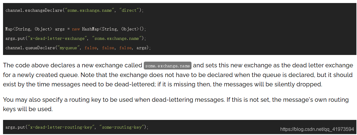 在上面这段代码中,前三个Bean属于通用配置,死信队列中需要有两个参数x-dead-letter-exchange和x-dead-letter-routing-key,分别表示死信交换机和死信路由,在官网中对这两个参数如何编写有教程: