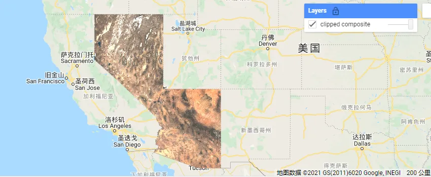 // Load Landsat 7 raw imagery and filter it to April-July 2000. var collection = ee.ImageCollection('LANDSAT/LE07/C01/T1') .filterDate('2000-04-01', '2000-07-01'); // Reduce the collection by taking the median. var median = collection.median(); // Load a table of state boundaries and filter. //在线加载我么要裁剪的边界,可以上传利用你的属性名称来筛选就好 var fc = ee.FeatureCollection('TIGER/2016/States') .filter(ee.Filter.or( ee.Filter.eq('NAME', 'Nevada'), ee.Filter.eq('NAME', 'Arizona'))); // Clip to the output image to the Nevada and Arizona state boundaries. //裁剪已经编辑好的fc矢量边界 var clipped = median.clipToCollection(fc); // Display the result. Map.setCenter(-110, 40, 5); var visParams = {bands: ['B3', 'B2', 'B1'], gain: [1.4, 1.4, 1.1]}; Map.addLayer(clipped, visParams, 'clipped composite');