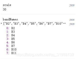 var image = ee.Image('LANDSAT/LC8_L1T/LC80440342014077LGN00') .select(['B2', 'B3', 'B4', 'B5', 'B6', 'B7', 'B10', 'B11']); var scale = image.projection().nominalScale(); var bandNames = image.bandNames(); print("scale",scale) print("bandNames",bandNames)
