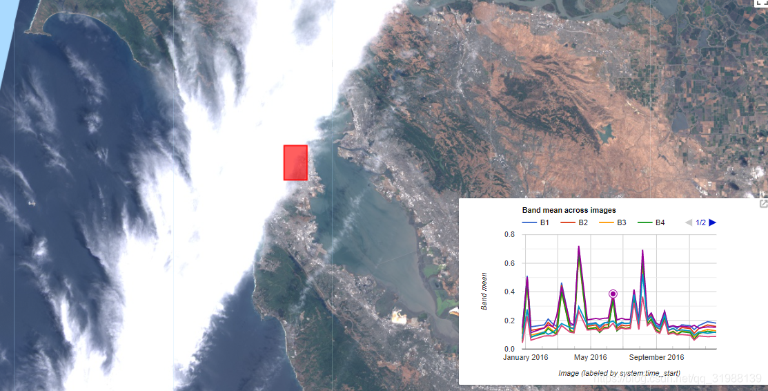 //选择需要研究的区域,给对焦点坐标形成矩形 var sanFrancisco = ee.Geometry.Rectangle(-122.45, 37.74, -122.4, 37.8); //筛选影像时间和波段的选取 var landsat8Toa = ee.ImageCollection('LANDSAT/LC08/C01/T1_TOA') .filterDate('2015-12-25', '2016-12-25') .select('B[1-7]'); // 创造一个随时间变化的折线图. var chart = ui.Chart.image.series({ imageCollection: landsat8Toa, region: sanFrancisco, reducer: ee.Reducer.mean(), scale: 200 }); //让上面的折线图设置属性并加载到map上 chart.style().set({ position: 'bottom-right', width: '500px', height: '300px' }); Map.add(chart); // 这个是设置你研究区域要在地图上显示的颜色,设置属性并加载在地图上同时设置地图显示的中心点坐标. var sfLayer = ui.Map.Layer(sanFrancisco, {color: 'FF0000'}, 'SF'); Map.layers().add(sfLayer); Map.setCenter(-122.47, 37.7, 9); // 创造一个标签在地图上. var label = ui.Label('Click a point on the chart to show the image for that date.'); Map.add(label); // 设置点击,通过点击可以在标签上显示你想要的东西,是动态的实时的. chart.onClick(function(xValue, yValue, seriesName) { if (!xValue) return; // Selection was cleared. // 当点击你图标上的时间点的时候,你就可以显示当期的影像. var equalDate = ee.Filter.equals('system:time_start', xValue); var image = ee.Image(landsat8Toa.filter(equalDate).first()); var l8Layer = ui.Map.Layer(image, { gamma: 1.3, min: 0, max: 0.3, bands: ['B4', 'B3', 'B2'] }); Map.layers().reset([l8Layer, sfLayer]); // 在标签上显示这个时间节点的影像. label.setValue((new Date(xValue)).toUTCString()); });