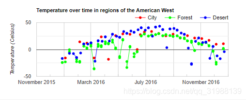 // 先分别设置不同区域的颜色 var COLOR = { CITY: 'ff0000', DESERT: '0000ff', FOREST: '00ff00' }; //之前我们觉得例子是点,这次我们选择面,同样是三个句型选择区域,分别给标签命名,最后作为你散点图上的图例 var city = ee.Feature( // San Francisco. ee.Geometry.Rectangle(-122.45, 37.74, -122.4, 37.8), {label: 'City'}); var forest = ee.Feature( // Tahoe National Forest. ee.Geometry.Rectangle(-121, 39.4, -120.8, 39.8), {label: 'Forest'}); var desert = ee.Feature( // Black Rock Desert. ee.Geometry.Rectangle(-119.15, 40.8, -119, 41), {label: 'Desert'}); //将多个句型放在一个矢量集合当中,注意,这里是以名字放入一个列表当中 var westernRegions = new ee.FeatureCollection([city, forest, desert]); // Get brightness temperature data for 1 year. var landsat8Toa = ee.ImageCollection('LANDSAT/LC08/C01/T1_TOA'); var temps2013 = landsat8Toa.filterBounds(westernRegions) .filterDate('2015-12-25', '2016-12-25') .select('B10'); //B10 Thermal infrared 1, resampled from 100m to 30m 30 meters 10.60 - 11.19 µm // 从B10波段的热红外波段值转化为温度值 temps2013 = temps2013.map(function(image) { return image.addBands(image.subtract(273.15).select([0], ['Temp'])); //返回值是一个运算玩的温度值,并且添加波段在第一个,并且命名为Temp }); // 这个就是设置时间序列的影像了,区域加载进来,平求出平均值 var tempTimeSeries = ui.Chart.image.seriesByRegion({ imageCollection: temps2013, regions: westernRegions, reducer: ee.Reducer.mean(), band: 'Temp', scale: 200, xProperty: 'system:time_start', seriesProperty: 'label' }); //设置图标的类型 tempTimeSeries.setChartType('ScatterChart'); //设置图标类型的参数 tempTimeSeries.setOptions({ title: 'Temperature over time in regions of the American West', vAxis: { title: 'Temperature (Celsius)' }, lineWidth: 1, pointSize: 4, series: { 0: {color: COLOR.CITY}, 1: {color: COLOR.FOREST}, 2: {color: COLOR.DESERT} } }); //最后答应出来 print(tempTimeSeries); Map.addLayer(desert, {color: COLOR.DESERT}); Map.addLayer(forest, {color: COLOR.FOREST}); Map.addLayer(city, {color: COLOR.CITY}); Map.setCenter(-121, 39.4, 6);