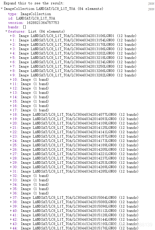 上一次博客中写道同样的影像结果应该是118幅,但是此次经过太阳高度的条件判断,最终就只有84幅了。而且可以从波段的数量上就能看出在返回为0的影像中仅有1各波段,就是一个list附加一个properties里面有一个指针也就是这副影像的系统位置名称