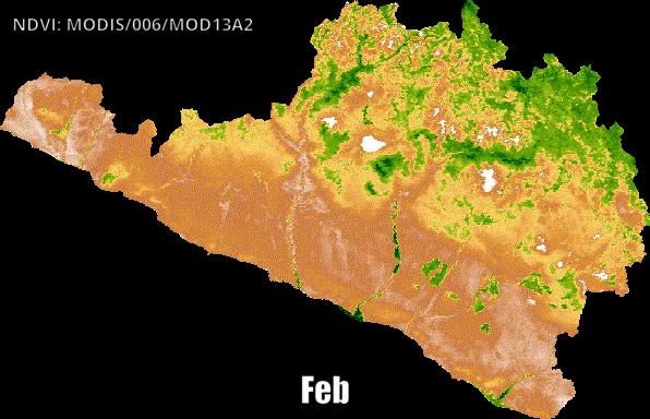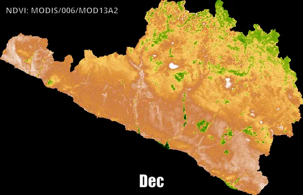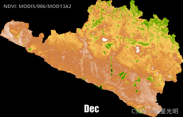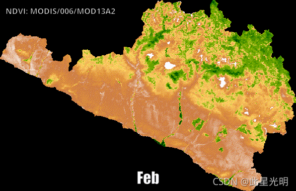 #animation动画参数设定可以设定标题字号大小动态显示的时间等等 animation <- ee_utils_gif_creator(rgbVis, gifParams, mode = "wb") animation %>% ee_utils_gif_annotate( text = "NDVI: MODIS/006/MOD13A2", size = 15, color = "white", location = "+10+10" ) %>% ee_utils_gif_annotate( text = dates_modis_mabbr, size = 30, location = "+290+350", color = "white", font = "arial", boxcolor = "#000000" ) # -> animation_wtxt # ee_utils_gif_save(animation_wtxt, path = "raster_as_ee.gif")