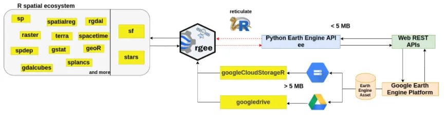 rgee是不是像JavaScript或Python客户端本地地球引擎API。从头开始开发地球引擎 API 将很难维护,尤其是考虑到 API 正在积极开发中。那么,如何使用 R 运行 Earth Engine?答案是网状的。reticulate是一个 R 包,旨在实现 R 和 Python 之间的无缝互操作。当在 R 中创建Earth Engine请求时,reticulate会将这部分转换为 Python。一旦生成了 Python 代码,就会Earth Engine Python API将请求转换为一种JSON格式。最后,GEE 平台通过 Web REST API 接收请求。该反应将遵循同样的路径。