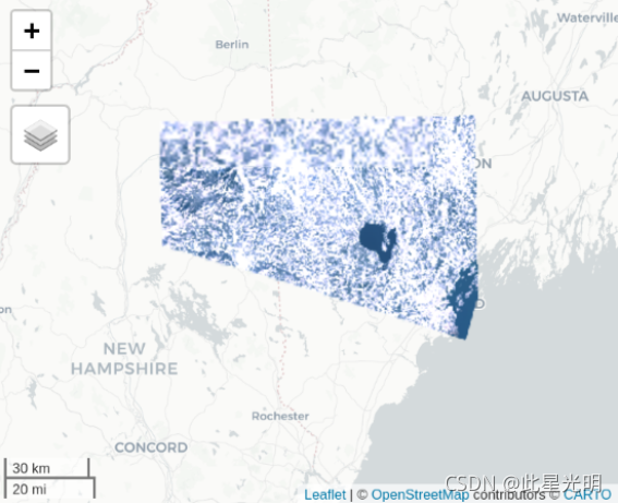 # 加载卫星影像 sen <- ee$ImageCollection("COPERNICUS/S2")$ filterBounds(ee$Geometry$Point(-70.48, 43.3631))$ filterDate('2019-01-01', '2019-12-31')$ sort('CLOUDY_PIXEL_PERCENTAGE')$ first() # 定义可视化参数 vizParams <- list( bands = c("B4", "B3", "B2"), min = 0, max = 2000, gamma = c(0.95, 1.1, 1) ) # 设置影像中心点和缩放 Map$centerObject(sen, 7) # 你将会看到 m1 <- Map$addLayer(sen, vizParams, 'first') m1