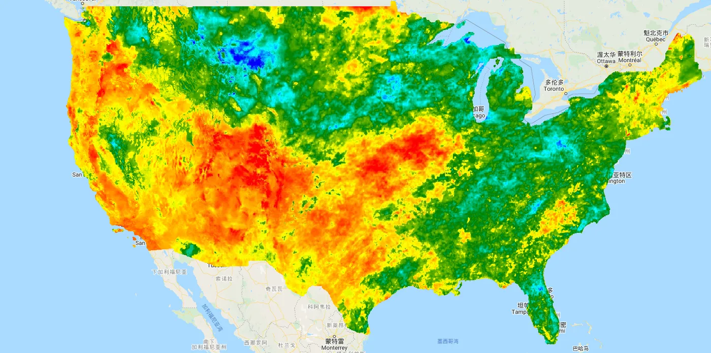 使用参考草表面的 Penman-Montieth 方程计算潜在蒸散量。土壤表层 2.5m 的可用土壤持水量来自 STATSGO 土壤数据库并用于计算。尽管 PDSI 通常是按月时间尺度计算的,但我们每个月计算三次这些数据以提供更及时的更新。由于 PDSI 计算的启动,应谨慎使用记录第一年的数据。