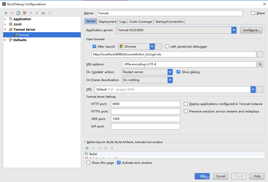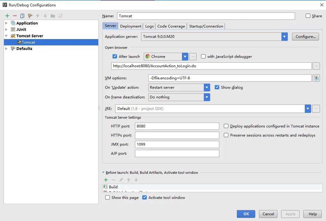 (1)打开Run/Debug Configuration,选择你的tomcat