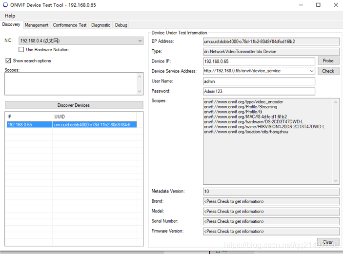为防止入坑,先用调试工具确认摄像头是可以被搜索到和设置参数的,如下图: