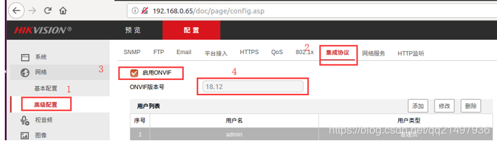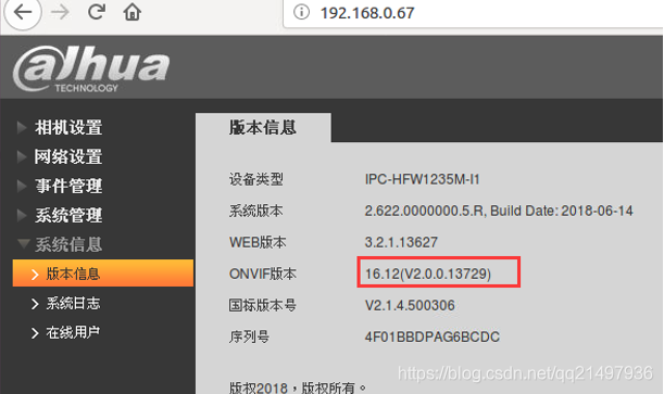 开启海康摄像头Onvif协议,查看到版本号,如下图: