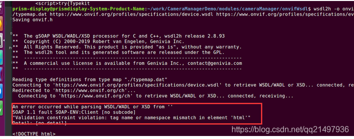 初步判断是新的版的onvif文件的编码问题,解析还未支持,无法解决,而又无法下载到合适的版本,错误如下图: