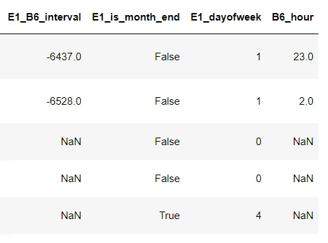 # 日期类型 df['E1_B6_interval'] = (df.E1.astype('datetime64[ns]') - df.B6.astype('datetime64[ns]')).map(lambda x:x.days) df['E1_is_month_end'] = pd.to_datetime(df.E1).map(lambda x :x.is_month_end) df['E1_dayofweek'] = df.E1.astype('datetime64[ns]').dt.dayofweek df['B6_hour'] = df.B6.astype('datetime64[ns]').dt.hour df.head()