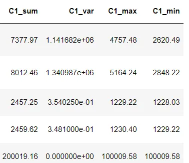 import numpy as np df['C1_sum'] = np.sum(df[['C1_fir','C1']], axis = 1) df['C1_var'] = np.var(df[['C1_fir','C1']], axis = 1) df['C1_max'] = np.max(df[['C1_fir','C1']], axis = 1) df['C1_min'] = np.min(df[['C1_fir','C1']], axis = 1) df['C1-C1_fir_abs'] = np.abs(df['C1-C1_fir']) df.head()