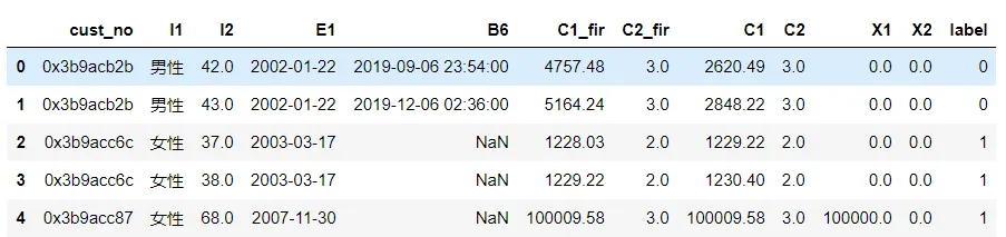 cust_no:客户编号;I1 :性别;I2:年龄 ;E1:开户日期; B6 :近期转账日期;C1 (后缀_fir表示上个月):存款;C2:存款产品数; X1:理财存款; X2:结构性存款; label:资金情况上升下降情况。