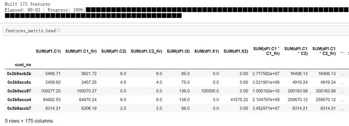 ## 运行DFS特征衍生 features_matrix,feature_names = ft.dfs(entityset=es, target_entity='df2', relationships = [relation1], trans_primitives=['divide_numeric','multiply_numeric','subtract_numeric'], agg_primitives=['sum'], max_depth=2,n_jobs=1,verbose=-1)