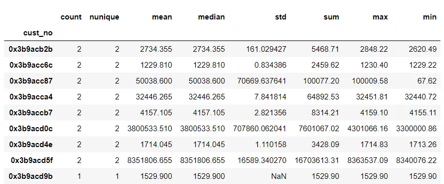 # 以cust_no做聚合,C1字段统计个数、唯一数、平均值、中位数、标准差、总和、最大、最小值 df.groupby('cust_no').C1.agg(['count','nunique','mean','median','std','sum','max','min'])